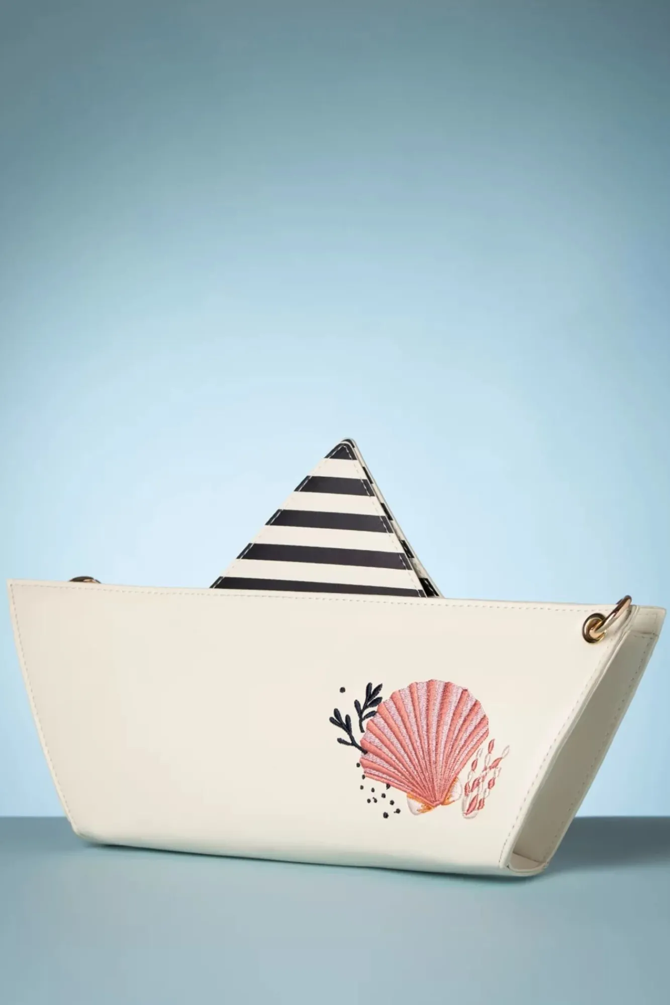 Lasse Diese Schöne Clutch In Der Form Eines Bootes Nicht An Dir Vorbeisegeln! Gefertigt Aus Kunstleder In Off White Mit Blauen Streifen Auf Den ‚Segeln‘ Und Einer Rosa, Gestickten Muschel Auf Der Vorderseite.