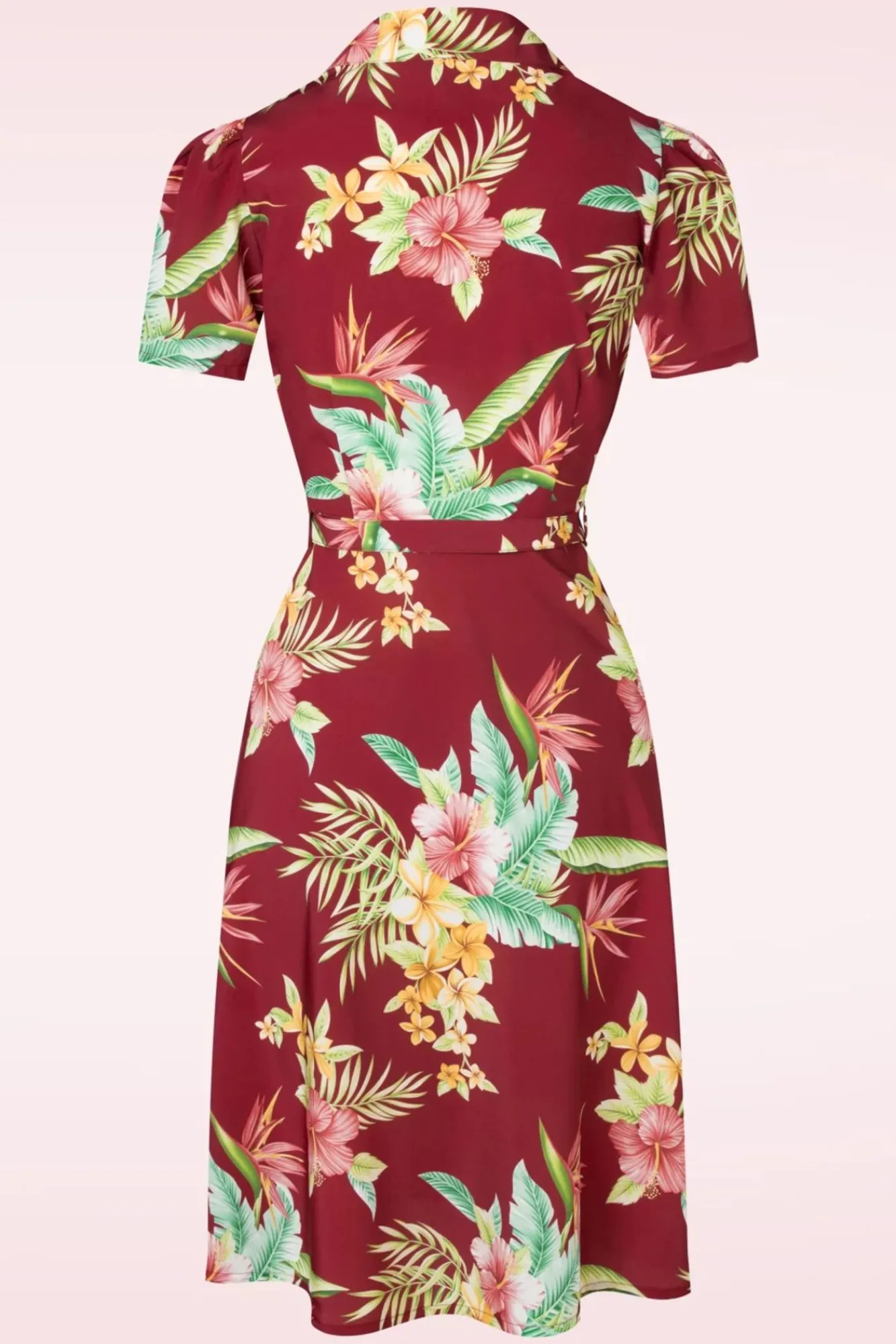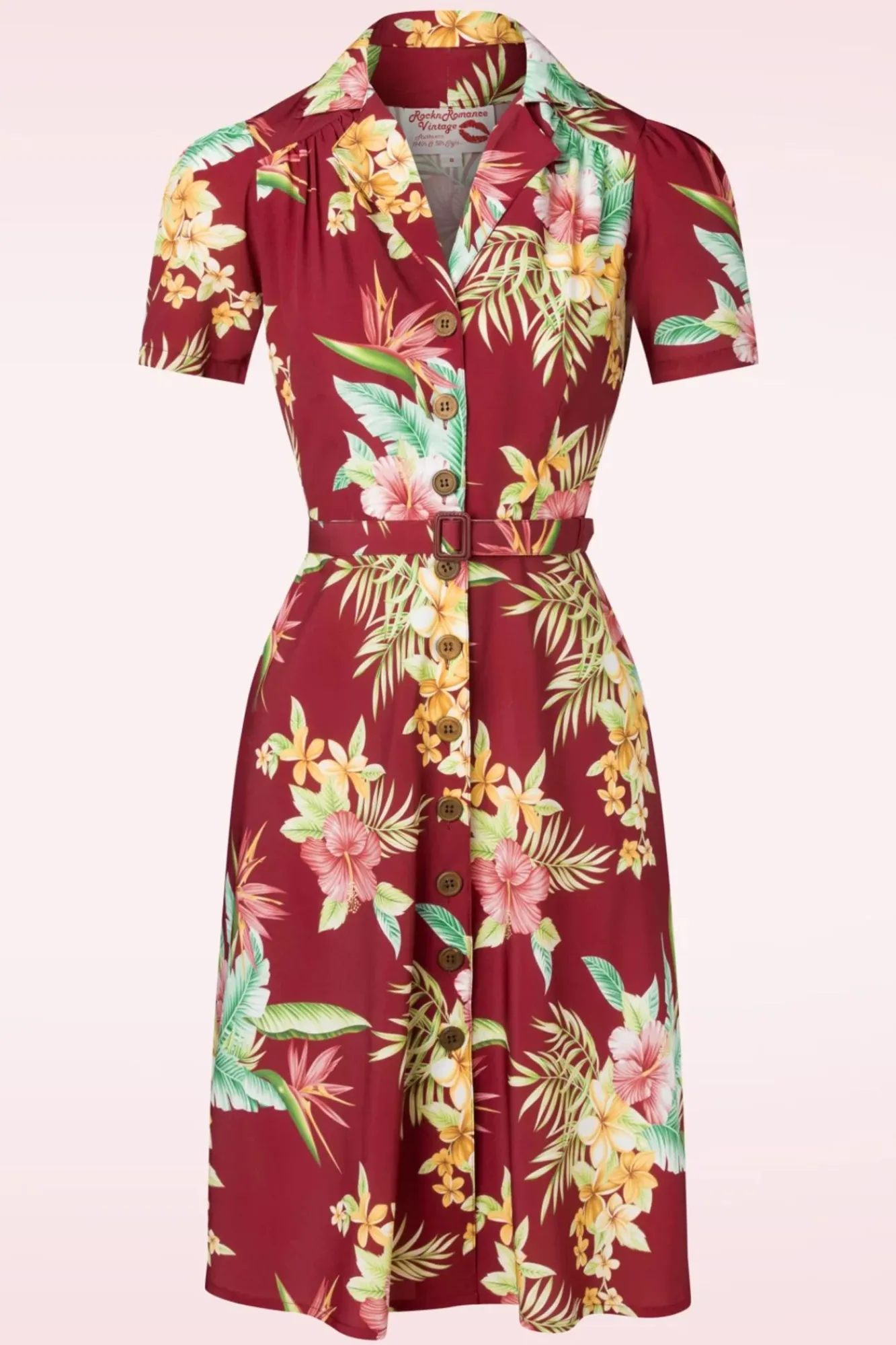 In Diesem 50Er Charlene Honolulu Shirtwaister Kleid In Burgundy Fühlst Du Dich Wie Auf Wolken! Dieses Wunderhübsche Vintage Kleid Ist Soooo Ikonisch. Dank Des Eleganten Reverskragens, Den Kurzen Puffärmeln, Der Reihe Mit Holzknöpfen, Dem Abnehmbaren Gürtel Und Dem Schmeichelnden Semi Swing Style. Hergestellt Aus Einem Angenehmen Und Luftigen, Bordeauxroten Crepe-Stoff ( Stretcht Nicht!) Verziert Mit Farbenfrohen Tropischen Blumen, Der Die Optik Und Haptik Des 50Er Jahre Hat. Ob Du Es Jetzt Eher Legere Trägst Oder Zu Einem ‚Full Fifties Look‘ Stylst, Charlene Ist Immer Die Richtige Wahl!