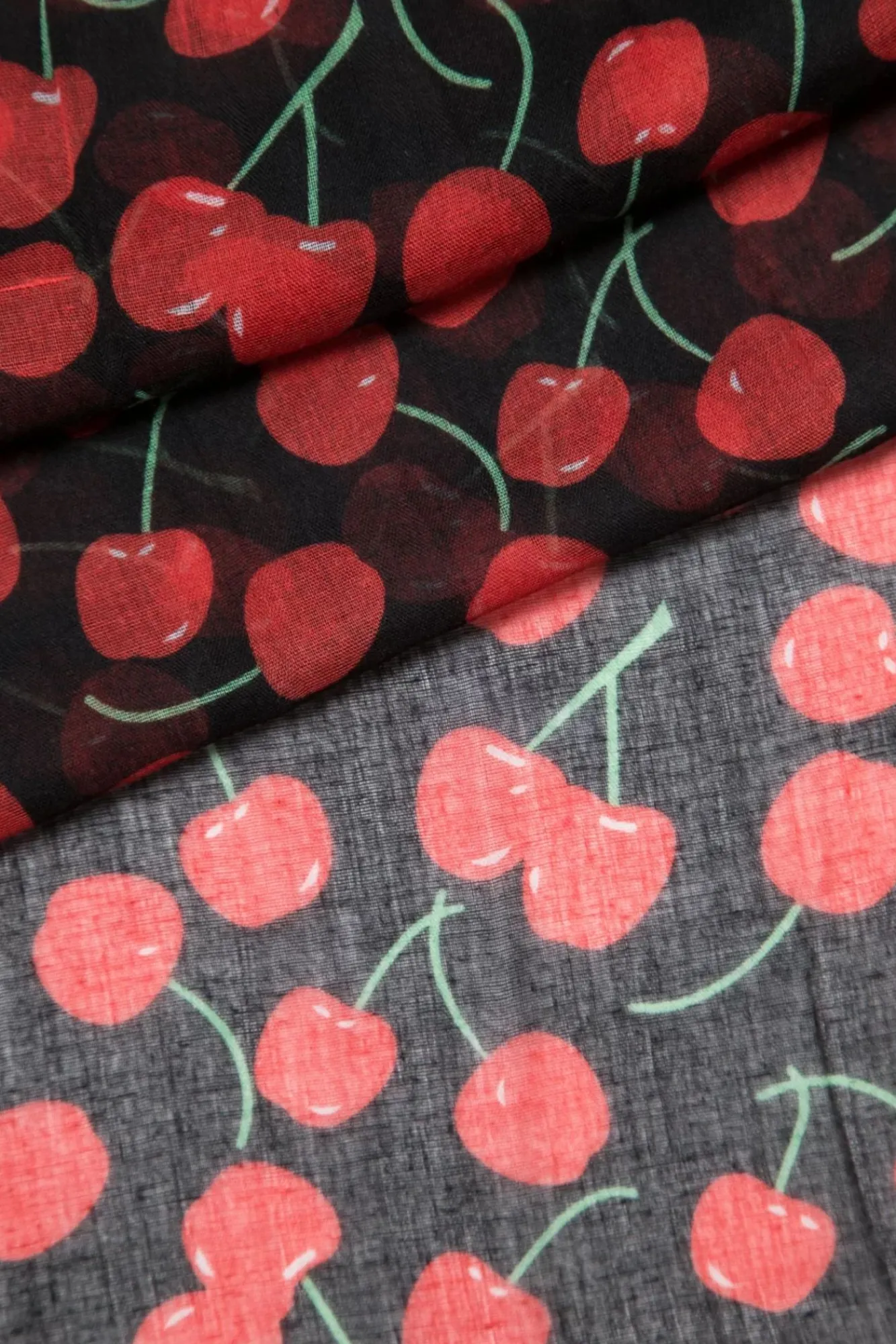 Dieser Schal Ist Wie Die Kirsche Auf Der Torte! Gefertigt Aus Schwarzer, Weicher Viskose, Die Mit Saftigen Roten Kirsch Gemustert Wurde.