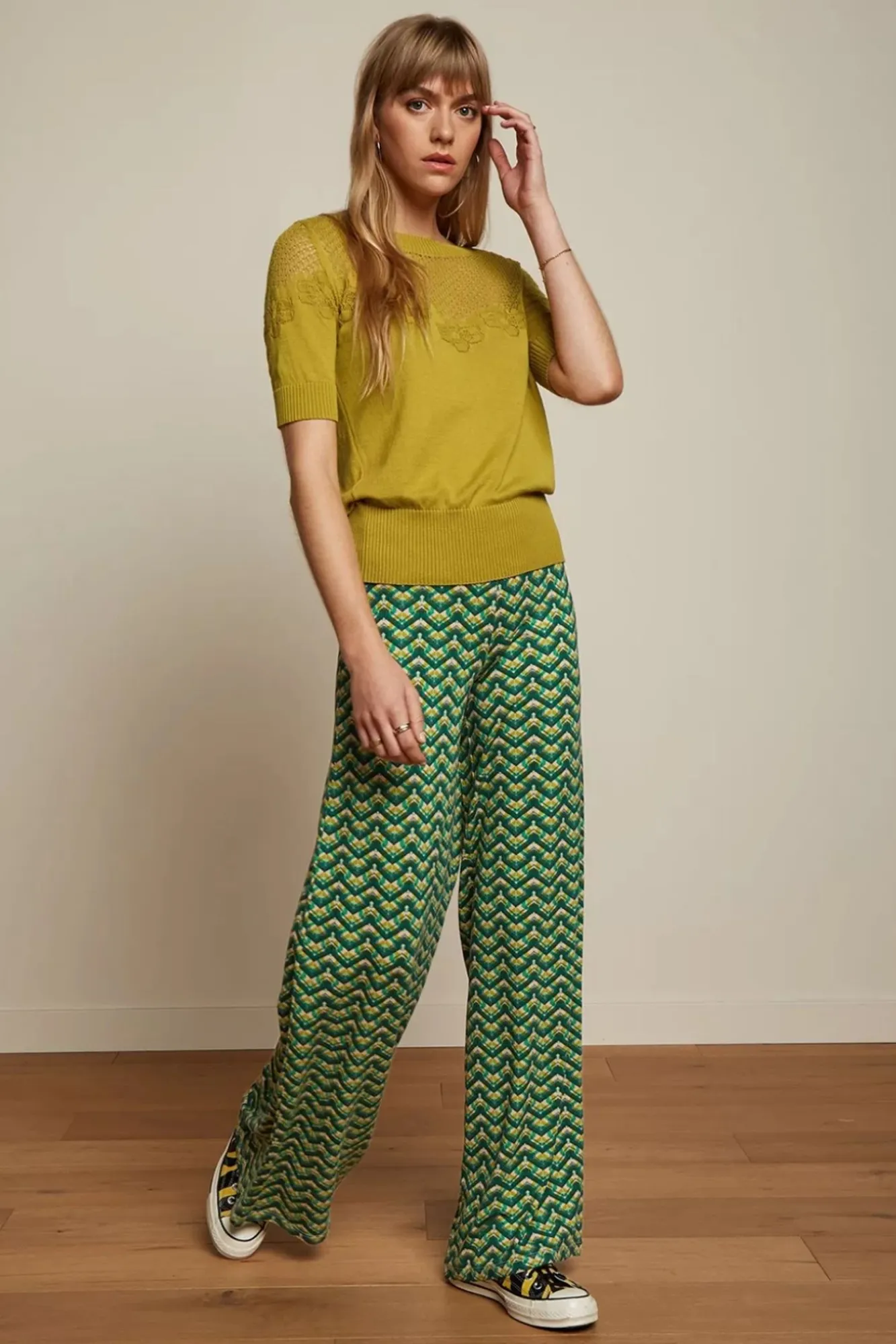 Eine Fabelhafte Hose Im Sixties Style Mit Dem Komfort Einer Legging? Yes Please! Diese Border Palazzo Brazza Hose In Jasper Green Hat Eine Hohe (Elastische) Taille Und Lange, Weit Ausgestellte Hosenbeine, Die Dafür Sorgen, Dass Deine Beine Endlos Lang Wirken. 😉 Hergestellt Aus Einem Festen, Aber Angenehmen Und Dehnbaren Ecovero Viskosemix, Versehen Mit Einem Wunderschönen Retromuster – Trägt Sich Herrlich. Komfortabel Sah Noch Nie So Gut Aus!