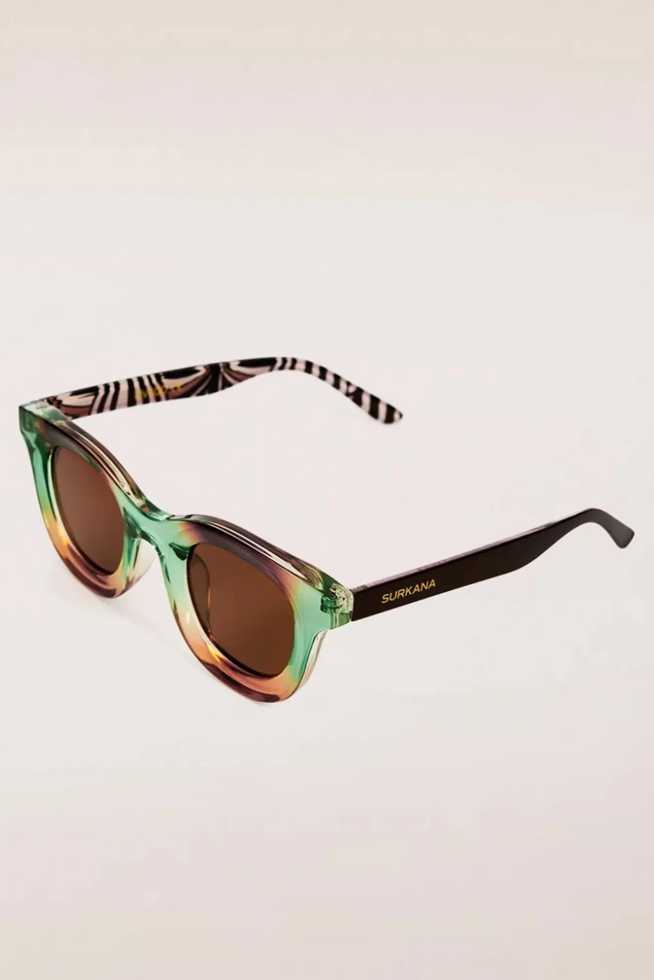 “Let Your Sunglasses Do The Talking!“ Ein Stylisches Modell Aus Recyceltem, Semi-Transparentem Kunststoff In Grün Und Braun, Mit Dunkelbraunen Bügel, Die Mit Einem Streifenmuster Und Braunen Polycarbonat Gläsern Aus Kunststoff Versehen Wurden.