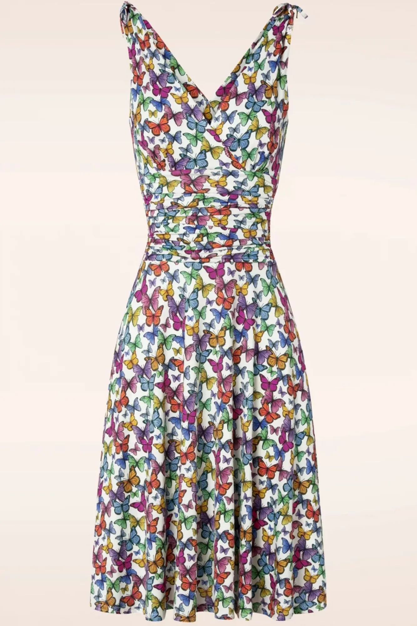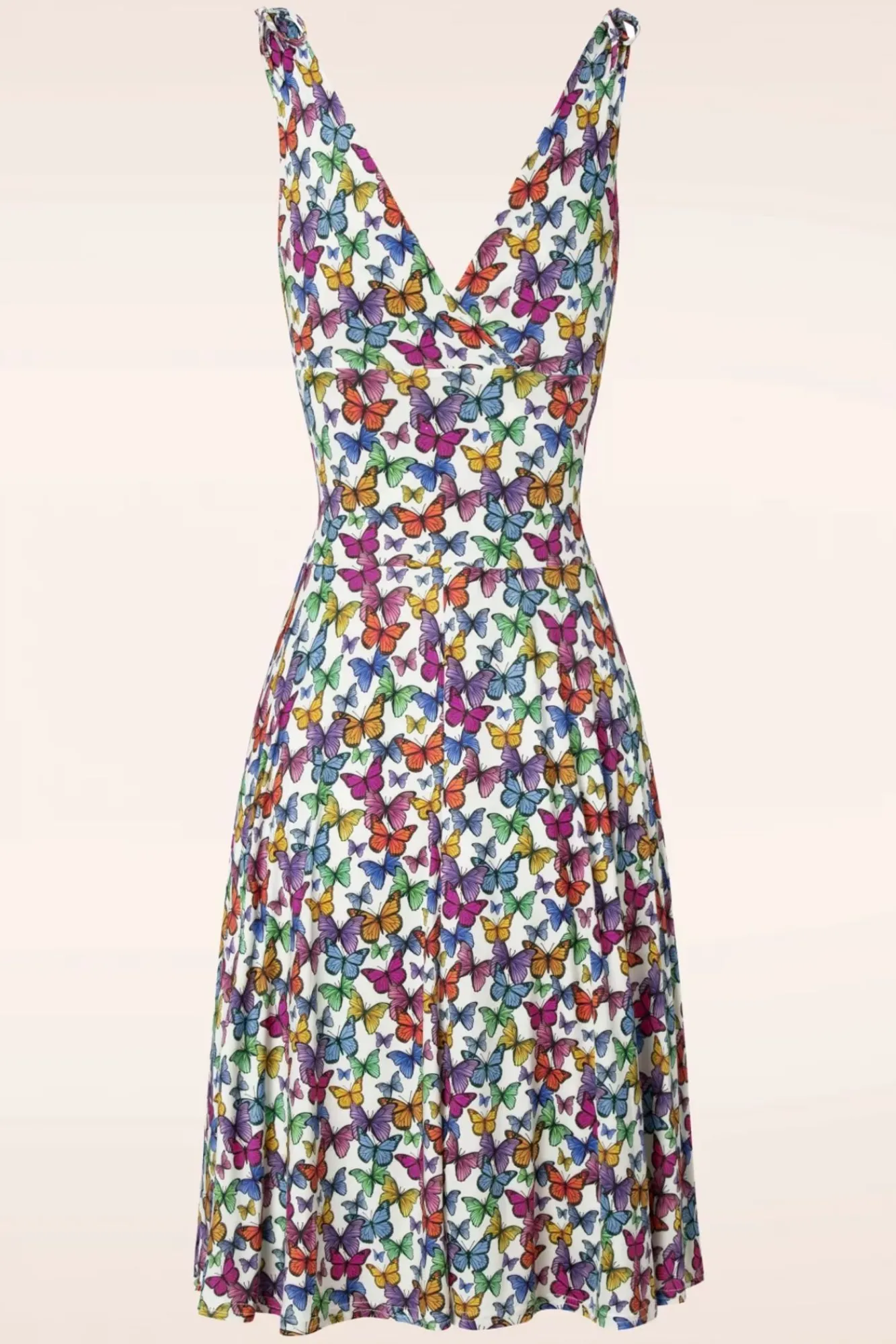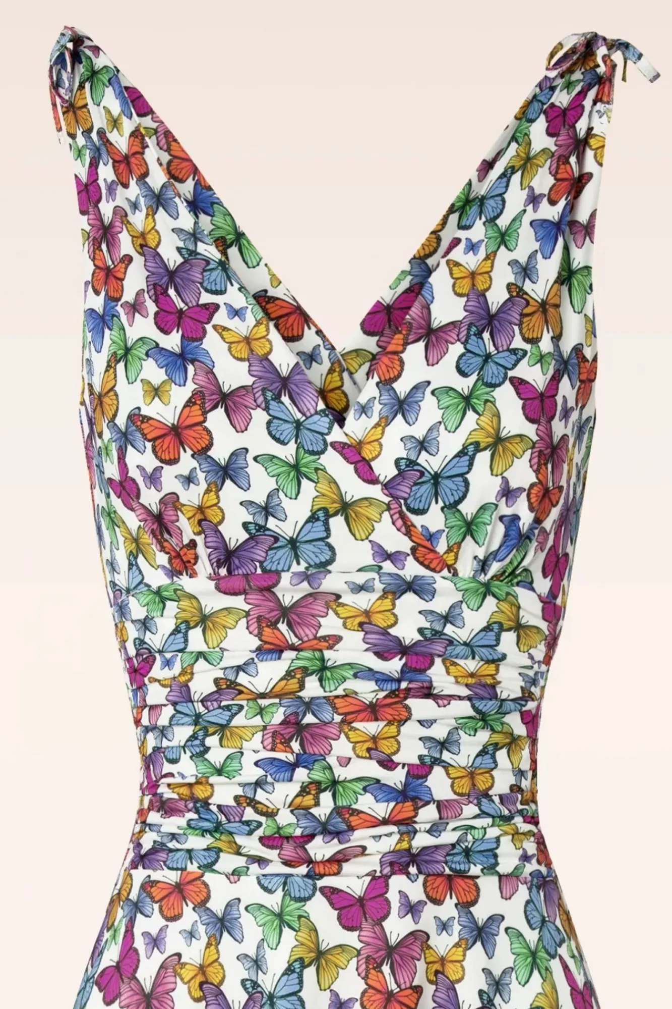 In Diesem Grecian Butterfly Kleid In Multi Wirst Du Zum Strahlenden Mittelpunkt! Das Oberteil Hat Sowohl Vorne Als Auch Hinten Ein Tiefes V Mit Schöner Wickeloptik, Das Ein Verführerisches Dekolleté Zeigt, Oh La La! Die Leicht Plissierten Körbchen Verlaufen In Breite Schulterbänder Und Werden Von Einer Spielerischen Schleife An Der Schulter Verziert. Hergestellt Aus Einem Glatten, Angenehmen Und Dehnbaren, Weißen Slinky Stoff, Der Mit Farbenfrohen Schmetterlingen Übersät Wurde Und Sich Herrlich Trägt. Spürst Du Die Schmetterlinge Schon In Deinem Bauch? 😉