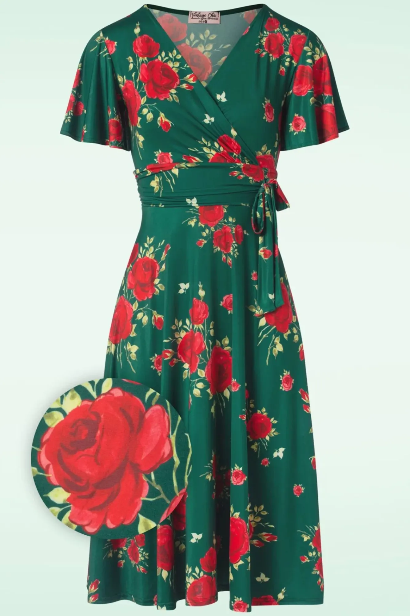 Wie Schön Dieses Irene Flower Cross Over Swing Kleid In Silky Grün Doch Ist! Du Fühlst Dich Total Feminin, Denn Es Hat Ein Wunderschönes, Enganliegendes Wickeltop Mit Verführerischem V-Ausschnitt, Spielerische Bindebänder, Die Man Sowohl Lose Als Auch Gebunden Tragen Kann Und Eine Schmeichelhafte Plissierte Taille. Die Flotten Schmetterlingsärmel Verleihen Dem Kleid Einen Verführerischen Touch, Während Der Schmeichelhafte Semi Swing Rock Für Eine Ordentliche Portion Eleganz Sorgt, Wow! Hergestellt Aus Einem Glatten Und Geschmeidigen, Leicht Glänzenden, Dunkelgrünen, Dehnbaren Stoff, Der Mit Wunderschönen Roten Rosen Übersät Wurde – Knitterfreies Tragevergnügen Garantiert. Irene Ist Liebe, Pure Kleid-Liebe!