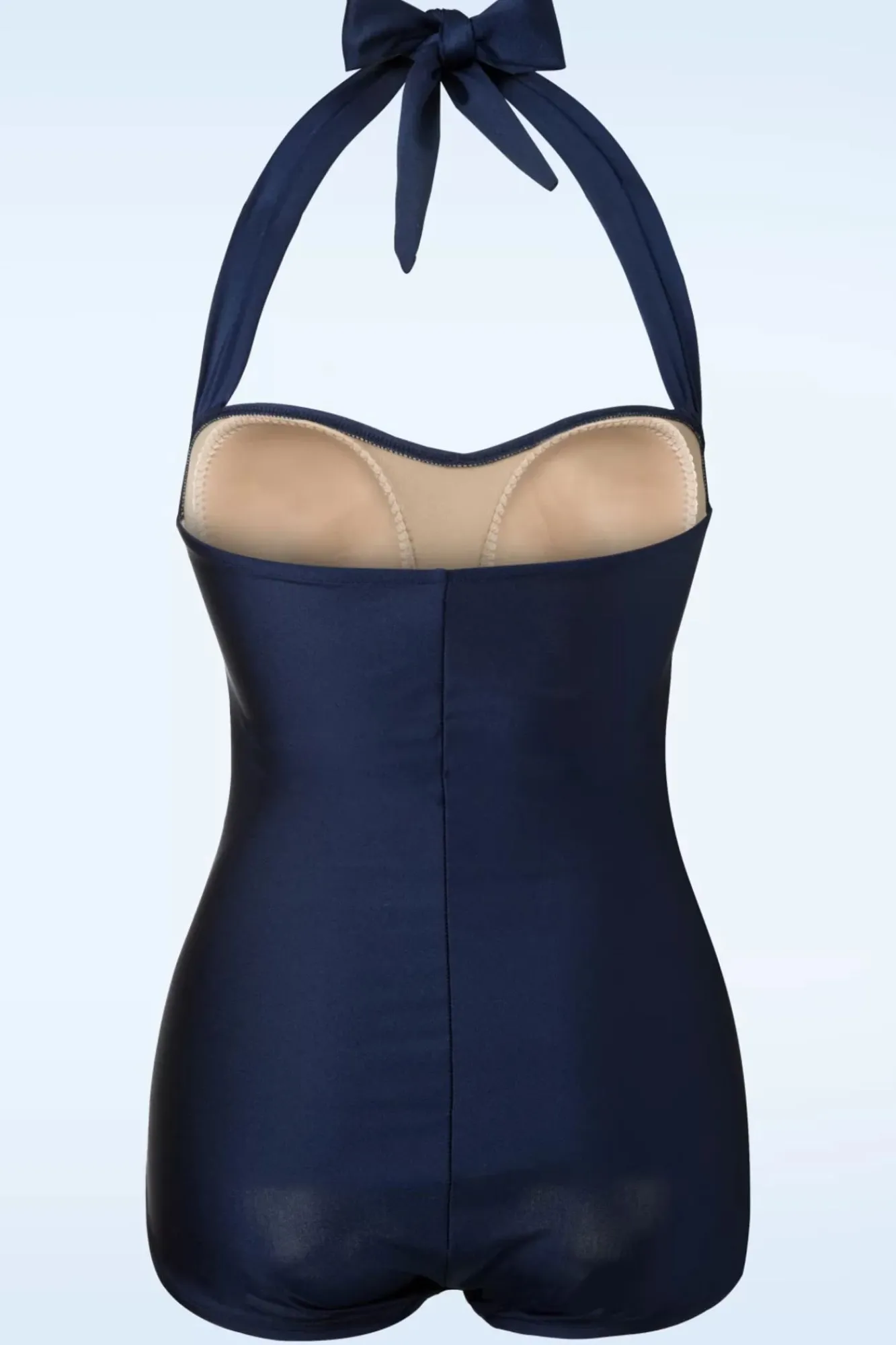 Dieser 50Er Classic Fifties One Piece Swimsuit In Navy Ist Ein Wundervoller, Den 50Er Jahren Nachempfundener, Badeanzug! Genau Wie Marilyn Monroe Haben Auch Wir Uns Bis Über Beide Ohren In Dieses Juwel Verliebt! Das Neckholder-Top Hat Einen Drapierten Sweetheart-Ausschnitt; Die Raffungen An Den Seiten Lassen Die Taille Schlanker Wirken Und Das ‚Kleidchen‘ Mit Falten-Details Weiß Auch Enorm Zu Schmeicheln. Das Durchdachte Design Kombiniert Mit Dem Verwendeten Material Sorgt Dafür, Dass Dieser Badeanzug Für Jeden Körpertyp Geeignet Ist. Hergestellt Aus Einem Dehnbaren Stoff In Dunkelblau, Mit Eingenähten Soft-Cups Und Einem Unterbrustband Für Extra Halt Und Ein Schönes Dekolleté. Dieses Schätzchen Ist Ein Echtes Must-Have, Do It Like Marilyn 😉