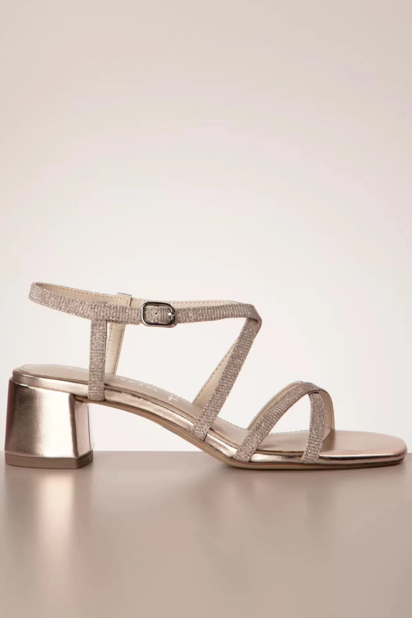 Neue Frühjahr/Sommer Kollektion ~ “Less Bitter, More Glitter!“ Ob Du Dich Nun Heute Für Den All-Out Vintage Party Look Oder Das Casual Outfit Entscheidest… Diese Offenen Sandalen Verleihen Jedem Outfit Etwas Glam! Glitzernde Bändchen Umrahmen Deinen Fuß. Gefertigt Aus Veganem Leder Und Stoff In Rose Wurde Diese Sandale Mit Gekreuzten Riemchen Und Einem Kleinen Blockabsatz Vollendet.
