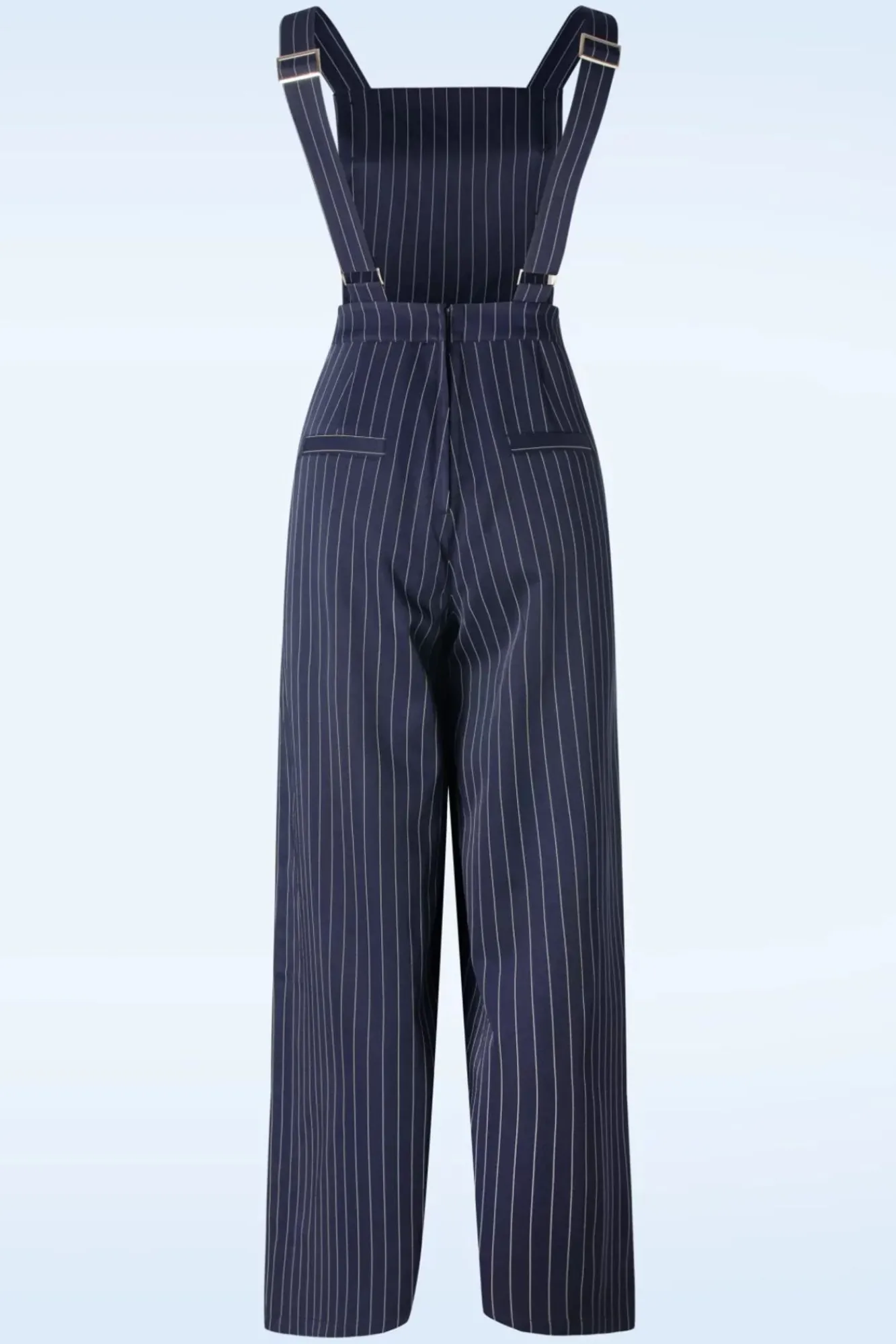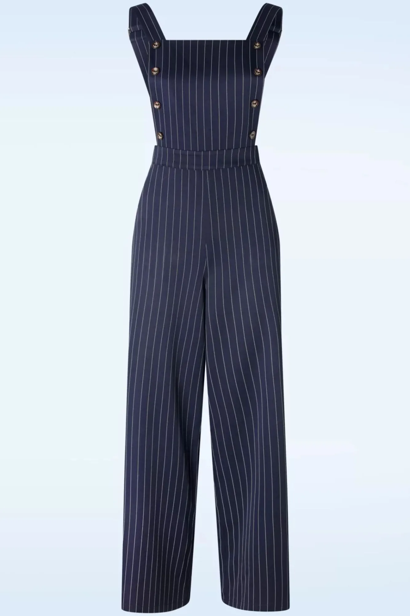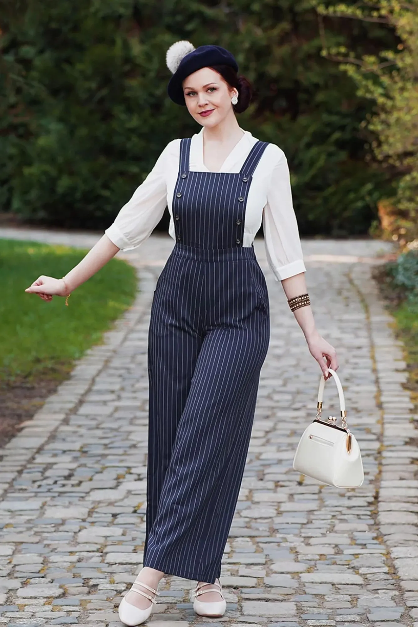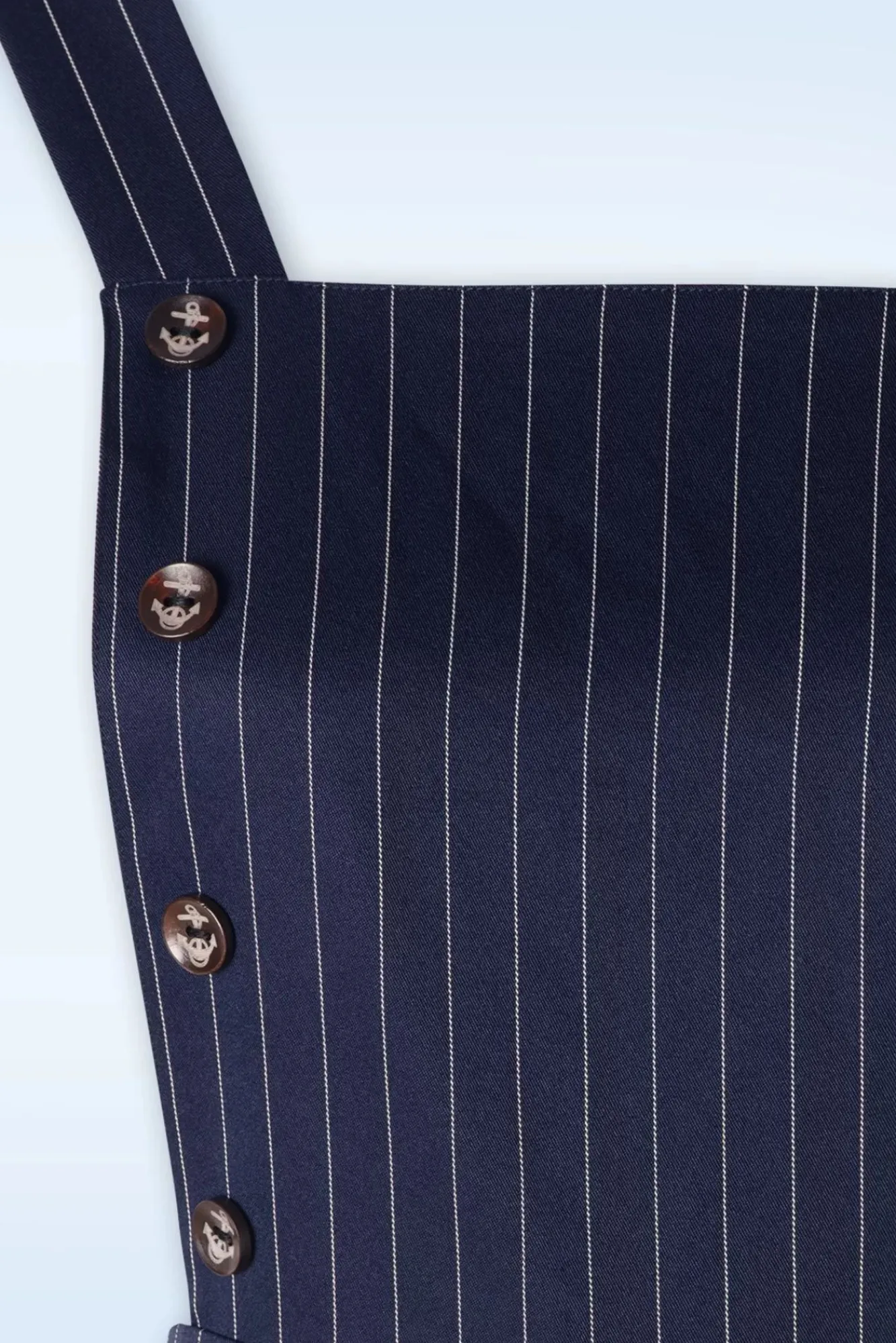 Mit Dieser Latzhose Wirst Du Über Dein Outfit Nicht Mehr Lange Grübeln Müssen! Gefertigt Aus Einem Festen, Aber Angenehmen, Marineblauen Stoff (Stretcht Amper) Mit Einem Weißen Kreidestreifen – Dieser Kaum Dehnbare Stoff Trägt Sich Herrlich Und Wurde Mit Zierknöpfen Mit Kleinen Ankern Versehen. Ein Top Oder Eine Bluse Dadrunter, Das Richtige Paar Schuhe Dazu Und Dein Retro Look Ist Ein Hingucker!