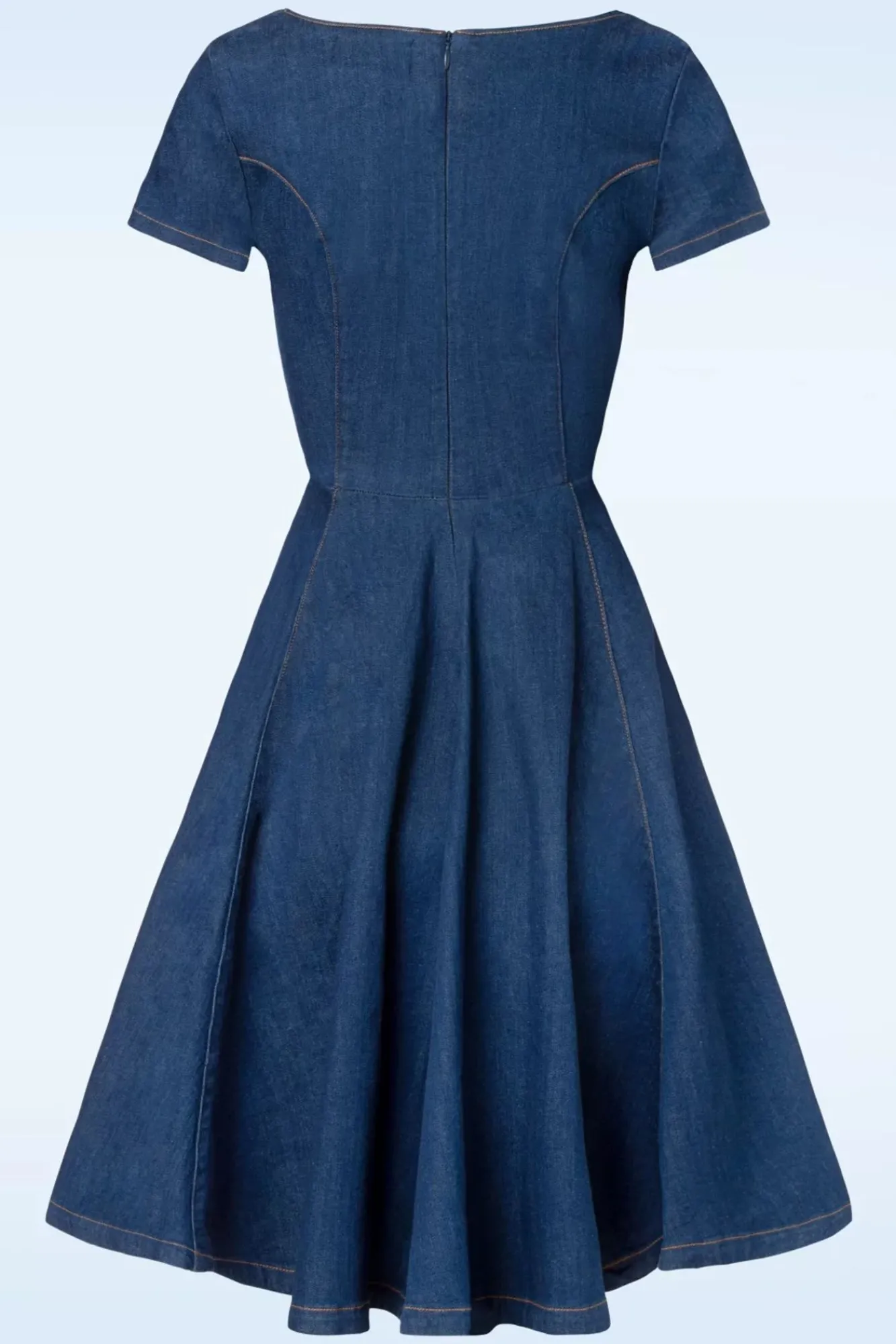 ‚Mit Der Richtigen Jeans Kann Eine Frau Die Welt Erobern!‘ Unsere Eigene Marke Rock-A-Booty Ist Bekannt Für ‚Denim Dreams’… Und Dieses 50Er Jenna-Anne Swing Kleid In Dark Denim Ist Ein Denim Traum, Der Unser Herz Schneller Schlagen Lässt! Jenna Hat Eine Charmante Sweetheart Halslinie, Kurze Cap-Ärmel Und Praktische Seitentaschen. Hergestellt Aus Einem Festen, Aber Dehnbaren, Dunkelblauen Baumwollmix, Der Sich Herrlich Trägt Und Mit Dunkelgelben Nähten Für Den Authentischen Touch Verziert Wurde… “Everything Worth Doing, Can Be Done In Denim!“