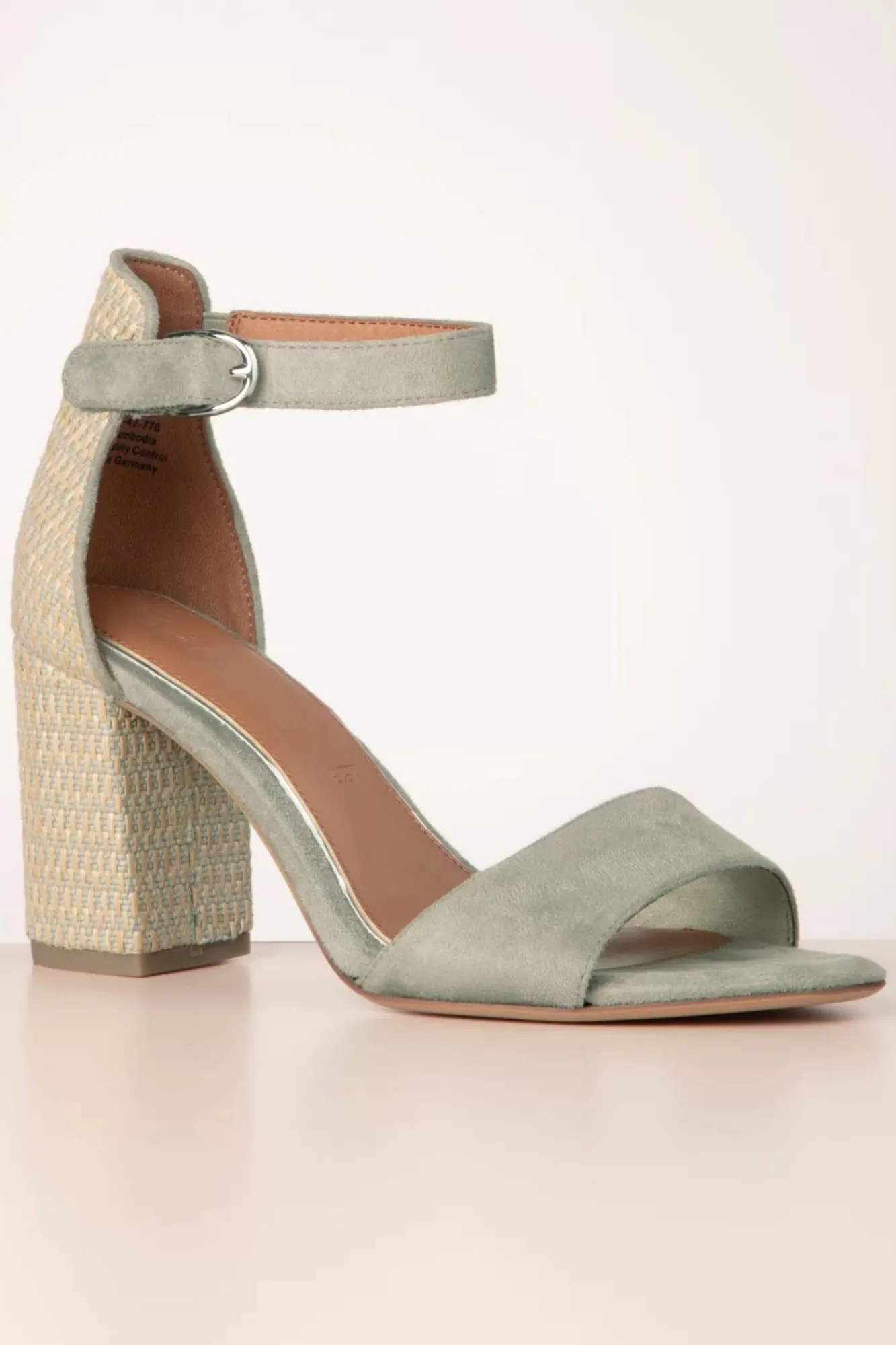 Neue Frühjahr/Sommer Kollektion ~ Liebe Füße, Trefft Euere Neuen Besten Freunde! – Diese Sandalen Mit Blockabsatz Wurden Aus Hellem Salbeigrünem Vegan Wildleder Gefertigt Und Mit Einem Geflochtenem Muster In Beige Versehen.