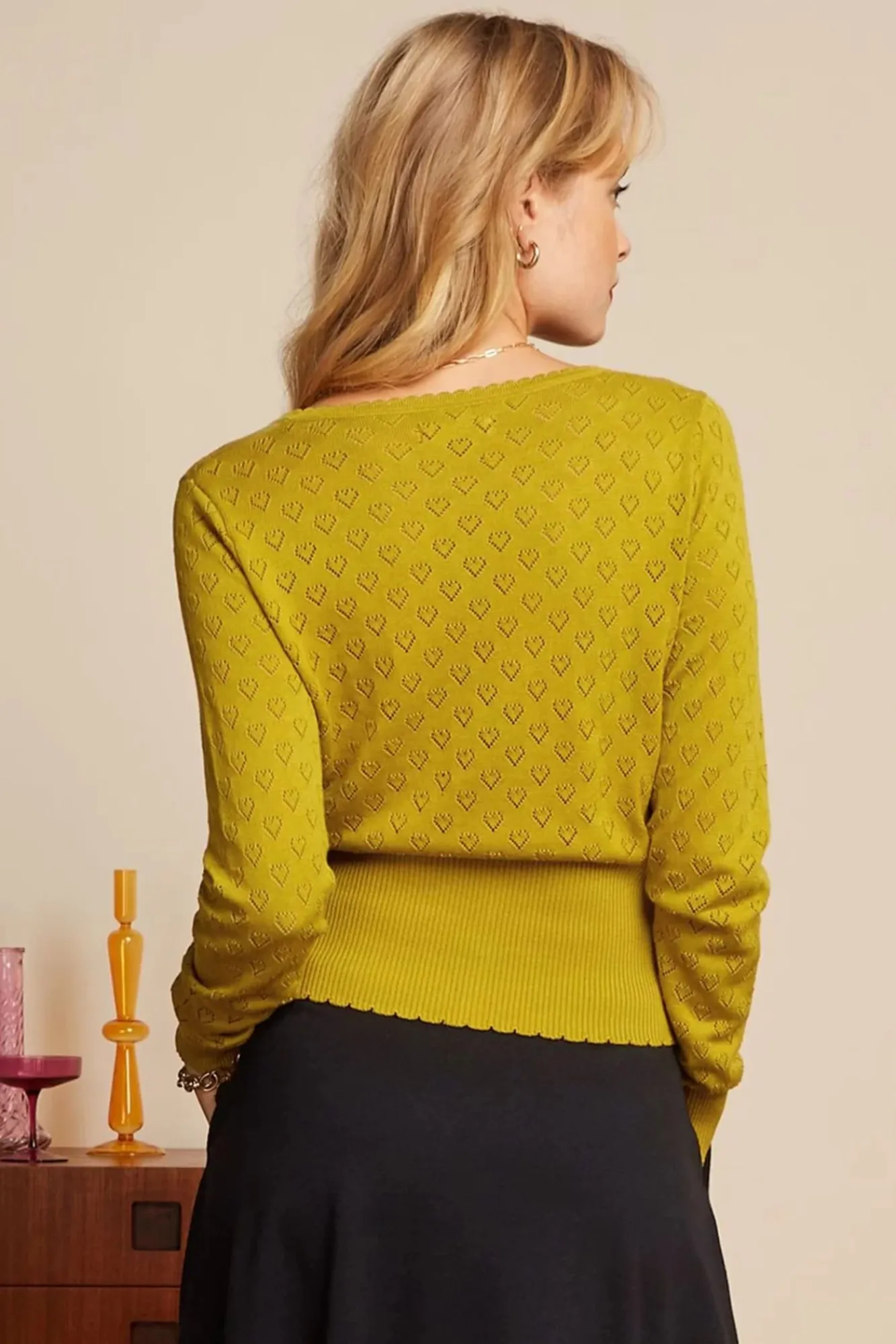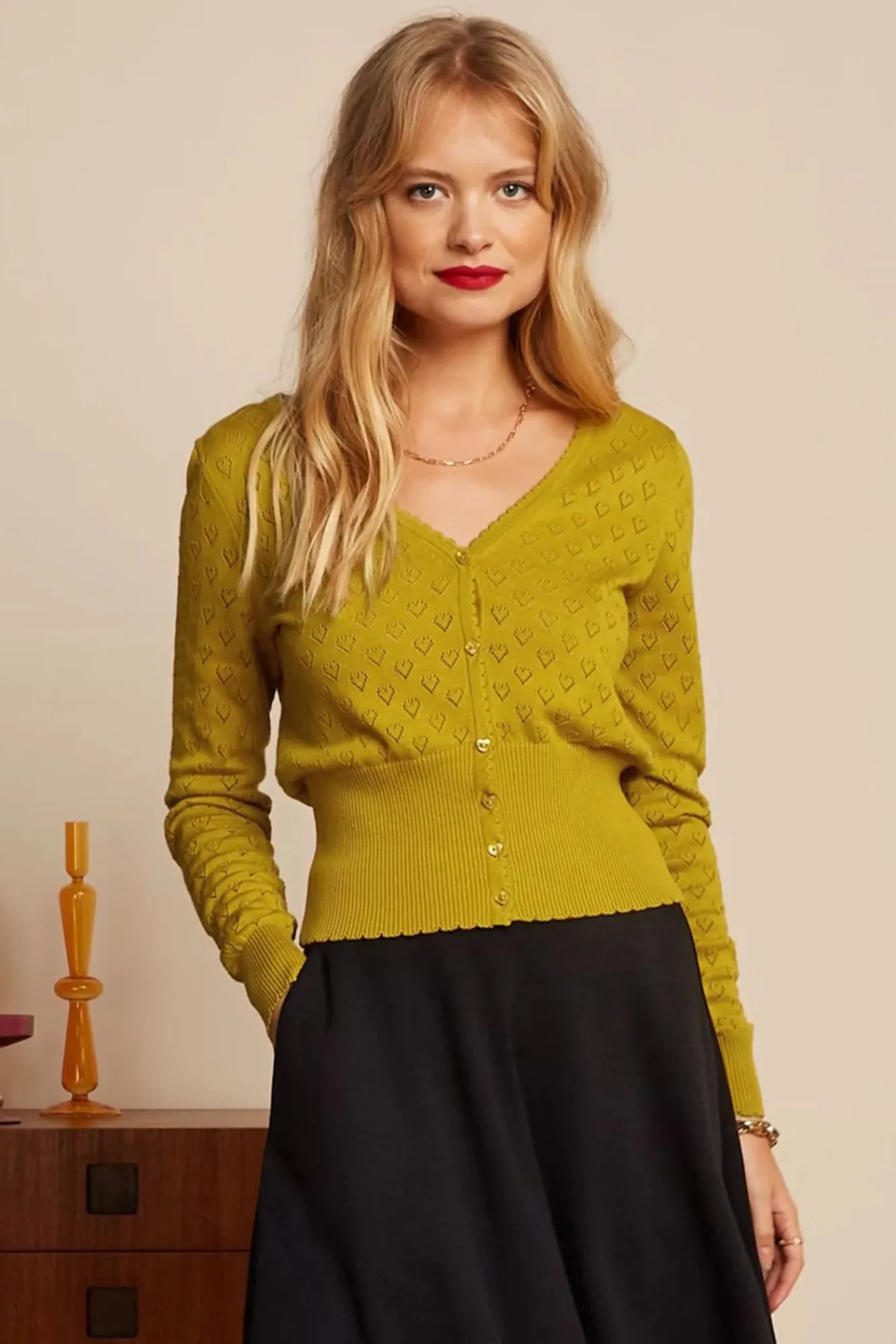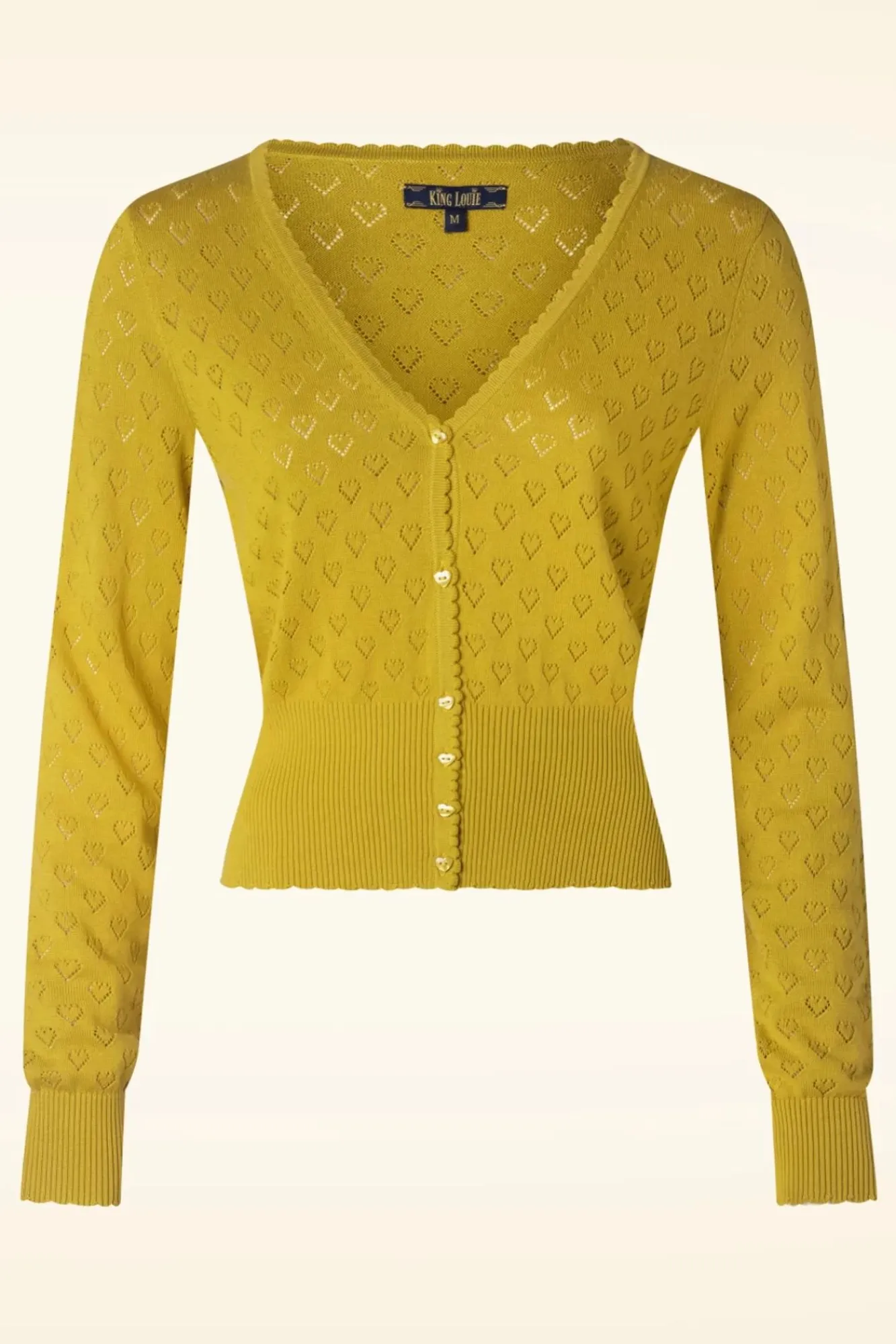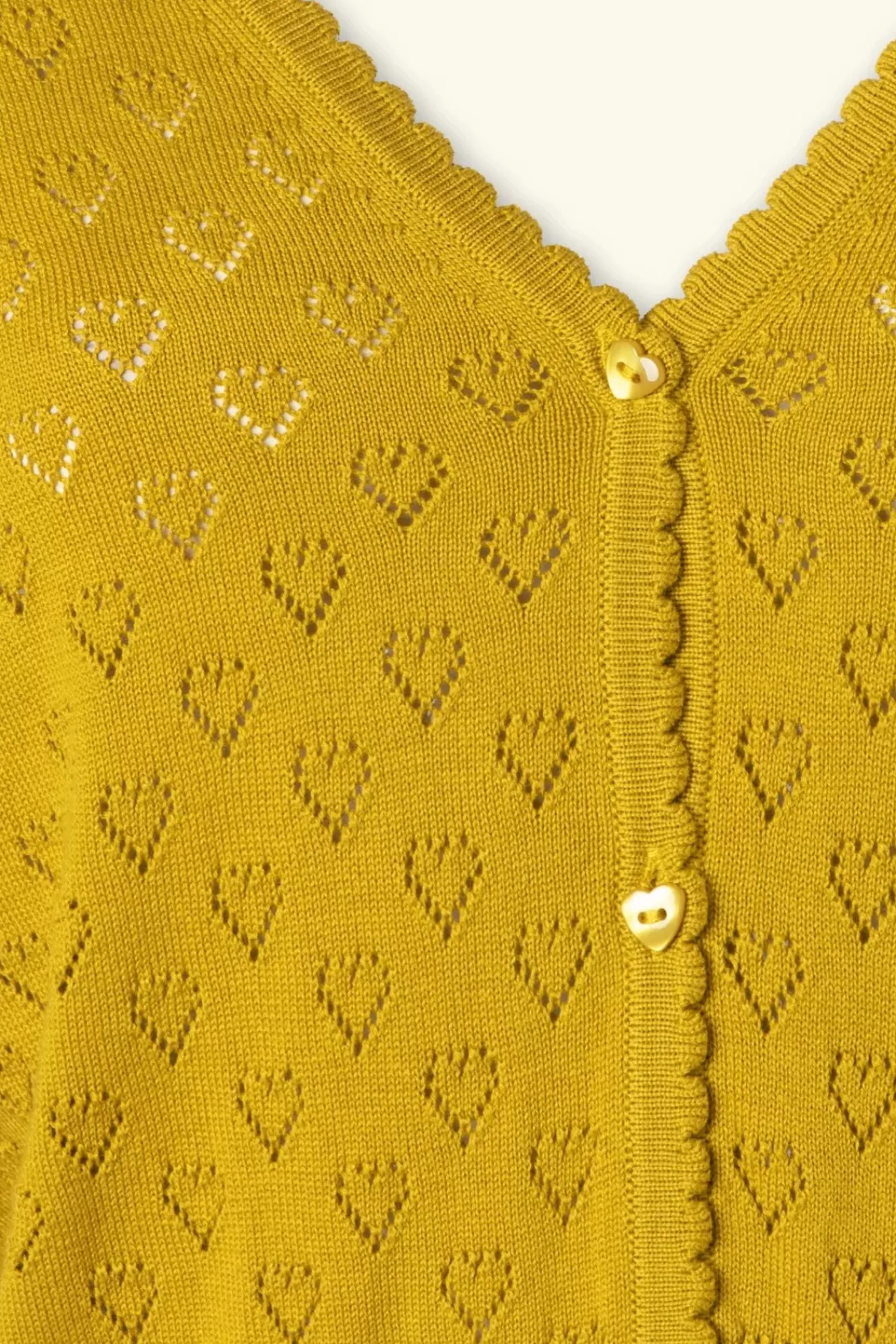 Wahre Liebe! – Diese Strickjacke Wurde Aus Einem Weichen, Feingestrickten, Currygelben Baumwollmix Mit Einem Herz-Lochmuster Gefertigt.