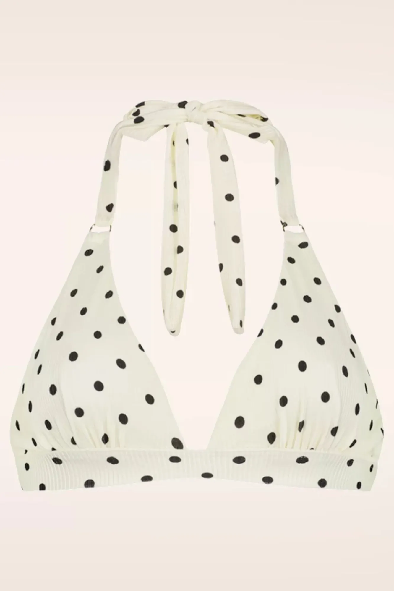 Definitiv Die Nummer 1 Diese Saison! – Dieses Bikini Neckholdertop Wurde Mit Gepolsterten Körbchen Versehen, Die Dir Ein Wunderbares Dekolleté Bescheren. Fein Plissiert Wurde Es Aus Einem Bequemen Und Perfekt Anliegenden Stoff In Elfenbeinweiß In Einem Schöne Glanz Mit Schwarzen Polka Dots Gefertigt.