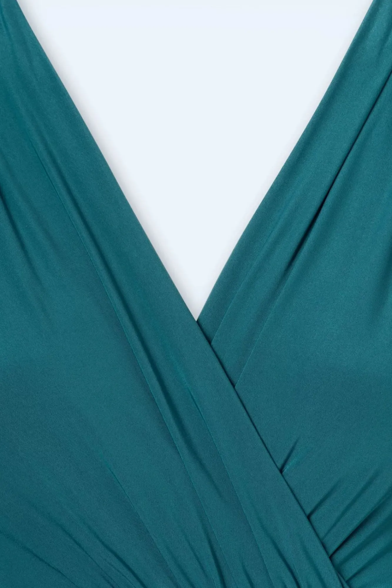Dieses Elegante 50Er Sadie Swing Kleid In Teal Ist Eine Echte Vintage Beauty Und Eigent Sich Für Perfekt Für Jede Gelegenheit! Das Enganliegende Top Mit Kurzen Schmetterlingsärmeln Hat Einen Großartigen V-Ausschnitt, Eine Schöne Wickeloptik, Ein Schmeichelnder Plissierter Taillenbund Und Einen Flotten Semi-Swing Rock. Hergestellt Aus Einem Glatten Und Angenehmen, Dehnbaren, Tealblauen Slinky Stoff, Der Sich Herrlich Trägt Und Nicht Knittert. Genieße Die Komplimente, Die Du Bekommst, Wenn Du Sadie Trägst!