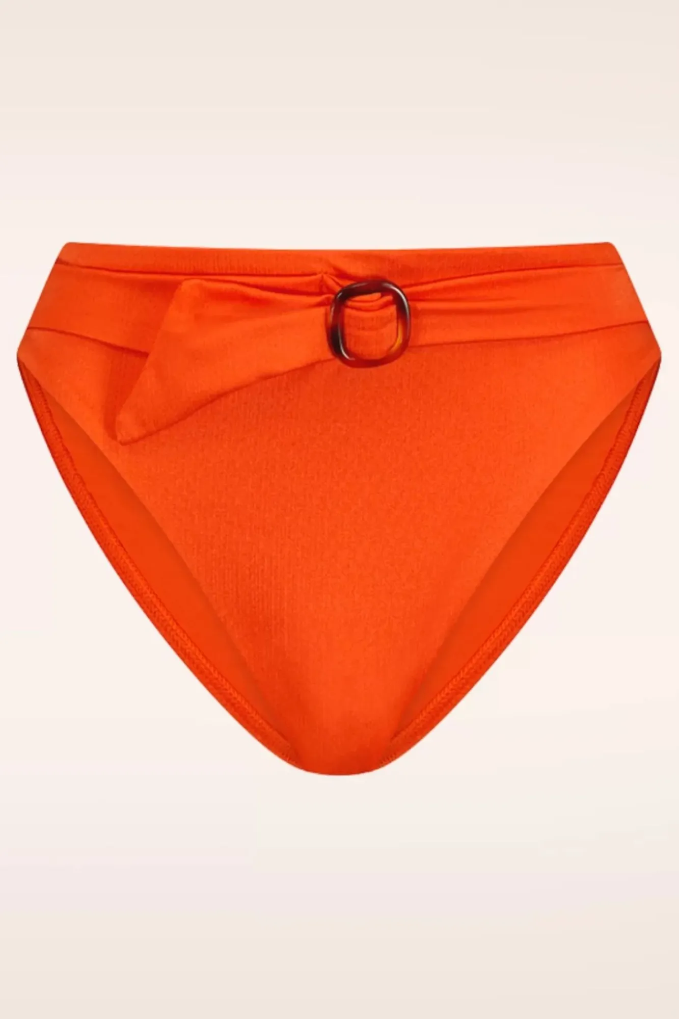 “The Only B.S I Need In My Life: Bikini And Sandals!“ Diese High Waist Bikinihose Mit Einer Braunen Schnalle Wurde Aus Einem Komfortablen, Perfekt Anliegenden Stoff In Orange-Rot Gefertigt, Der Mit Seidenartigem Glanz Für Ein Wenig Glamour In Der Sonne Sorgt.