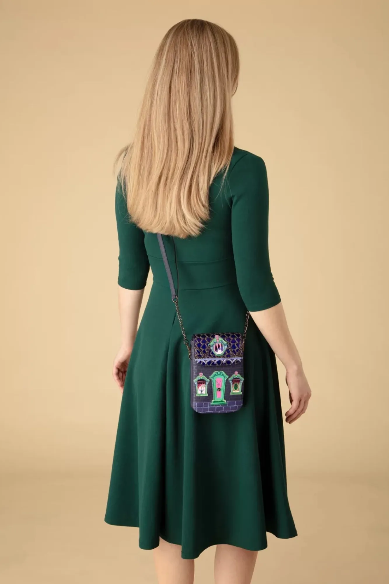 “Fangs For Stopping By‘!“ Ein Handytäschchen Aus Veganem Leder In Lila, Grün Und Rosa, Das Gleichzeitig Auch Als Portemonnaie Genutzt Werden Kann Und Das Schloß Von Cat Dracula Zeigt. Wegen All Der Unterschiedlichen Farben, Materialien Und Dem Delikaten Stickwerk Gleicht Es Fast Einem Detaillierten Kunstwerk An Dem Du Immer Etwas Neues Entdecken Kannst. “You Can Come In, I Won’T Bite… Yet!“