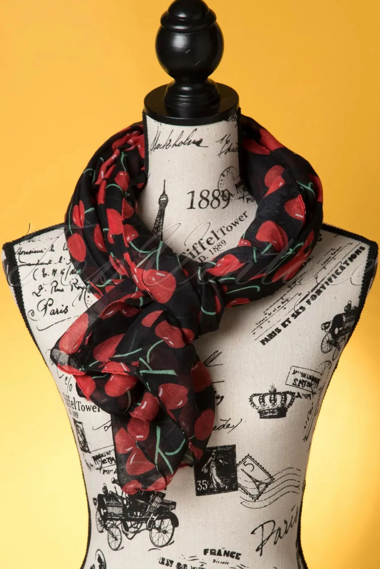 Dieser Schal Ist Wie Die Kirsche Auf Der Torte! Gefertigt Aus Schwarzer, Weicher Viskose, Die Mit Saftigen Roten Kirsch Gemustert Wurde.