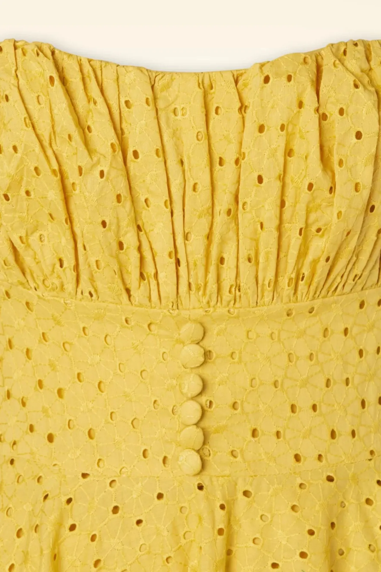 Das 50S Valerie Swing Dress In Mustard Wird Deine Neue Sommer-Romanze Werden! Diese Schwungvolle Schönheit Hat Ein Figurbetontes Top Mit Raffungen Am Busen, Zierknöpfe An Der Taille Und Schmale, Verstellbare Träger. Ab Taille Hat Es Einen Weiten Swingrock Der Eine Super Weibliche Silhouette Ergibt. Hergestellt Aus 100% Bio-Baumwolle In Broderie (Nicht Dehnbar) In Zenfgelb Und Vollständig Gefüttert. Herrlich Luftig Und Angenehm, Auch An Einem Warmen Tag. Trage Es Mit Hübschen Accessoires Und Zeige Dich Von Deiner Schönsten Seite! 😉