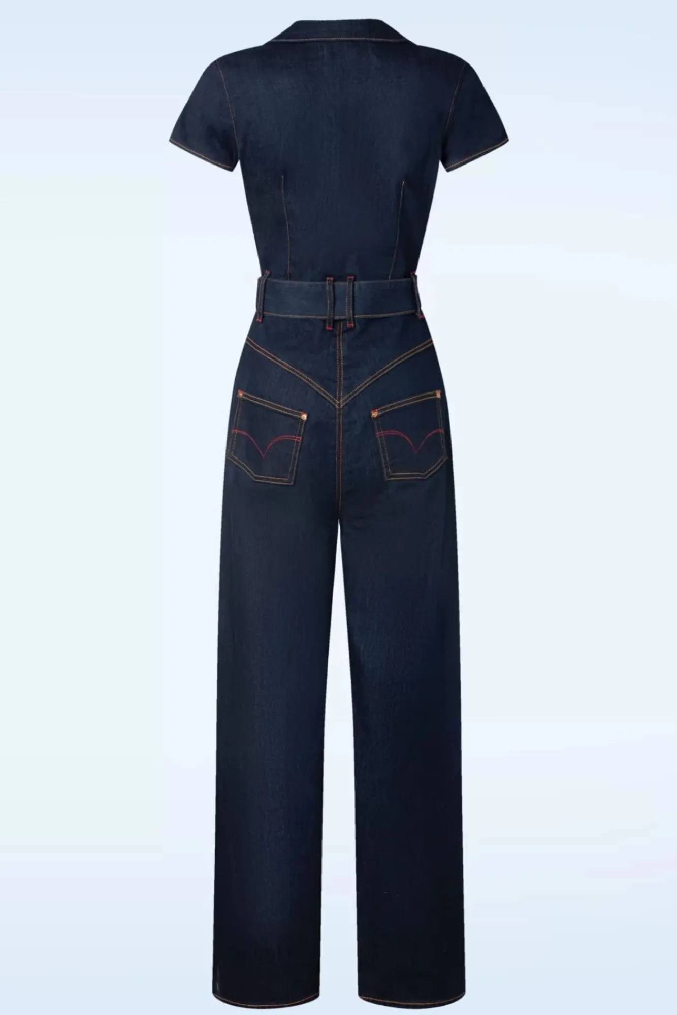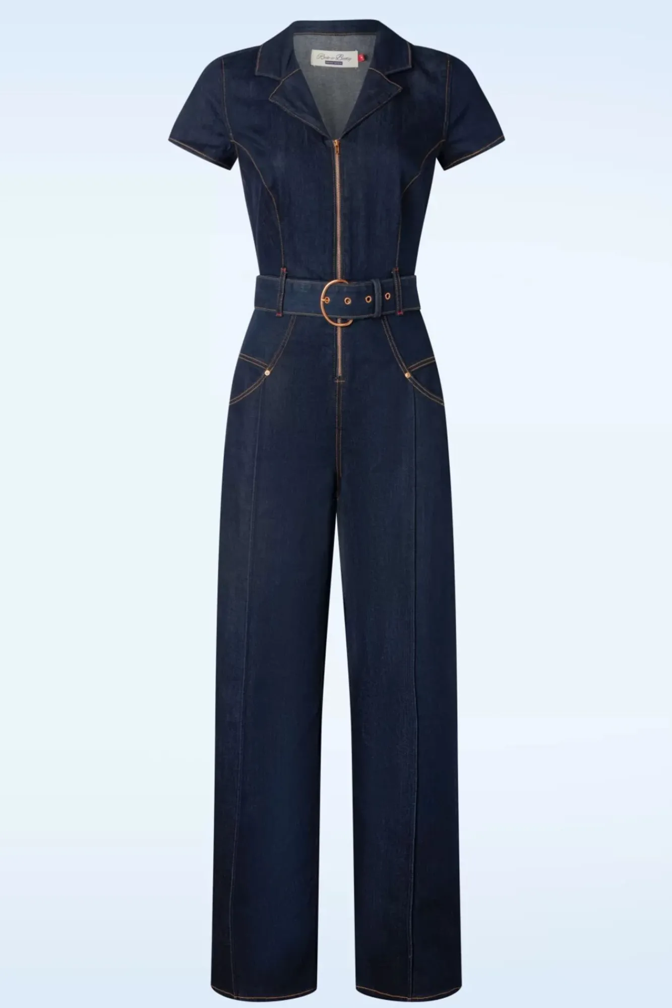Dieser Audrey Jumpsuit Ist Cool, Verspielt Und Feminin Zugleich…. Ein Traum, Der Wahr Wird! Er Wurde Aus Einem Wundervollen, Festen, Dunkelblauen Denim Baumwollmix Gefertigt, Der, Leicht Dehnbar, Perfekt Deinen Rundungen Folgt Und Mit Orange-Braunen Und Roten Nähten Und Einem Kupferfarbenen Reißverschluss An Der Vorderseite Vollendet Wurde.