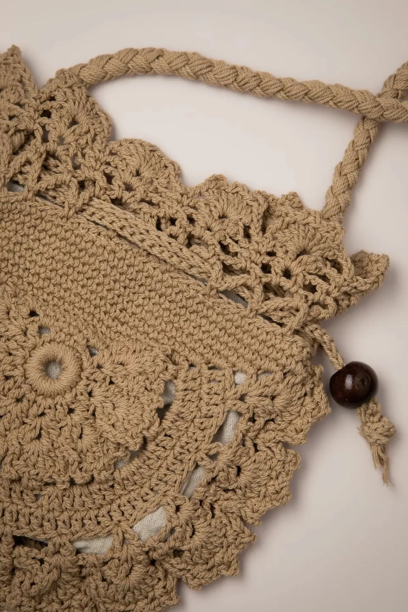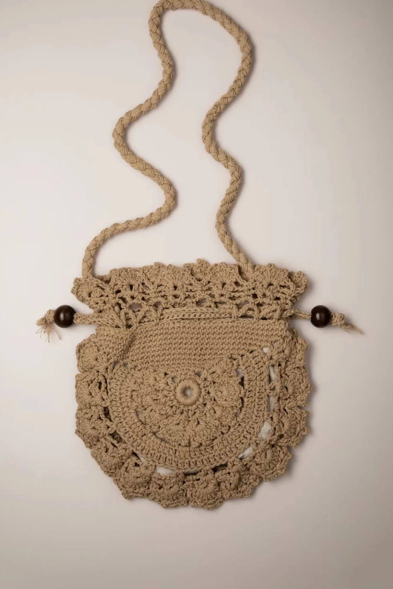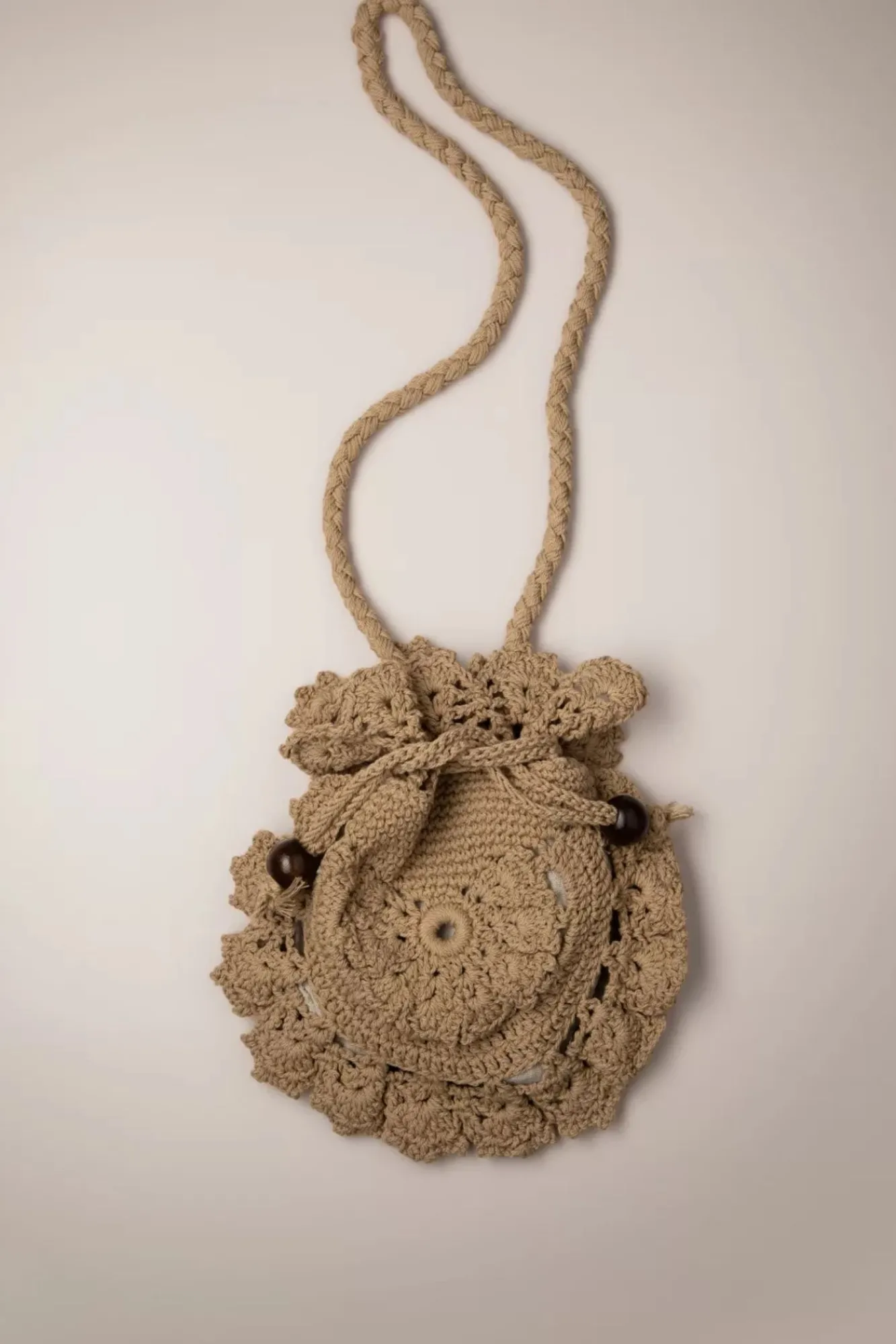 “Crochet… All Day, Everyday!“ 😉 Diese Gehäkelte Schultertasche In Sand In Der Form Eines Beutels Verleiht Jedem Outfit Den Boho Vibe Und Wurde Mit Ziehkordeln Mit Holzperlen Versehen.