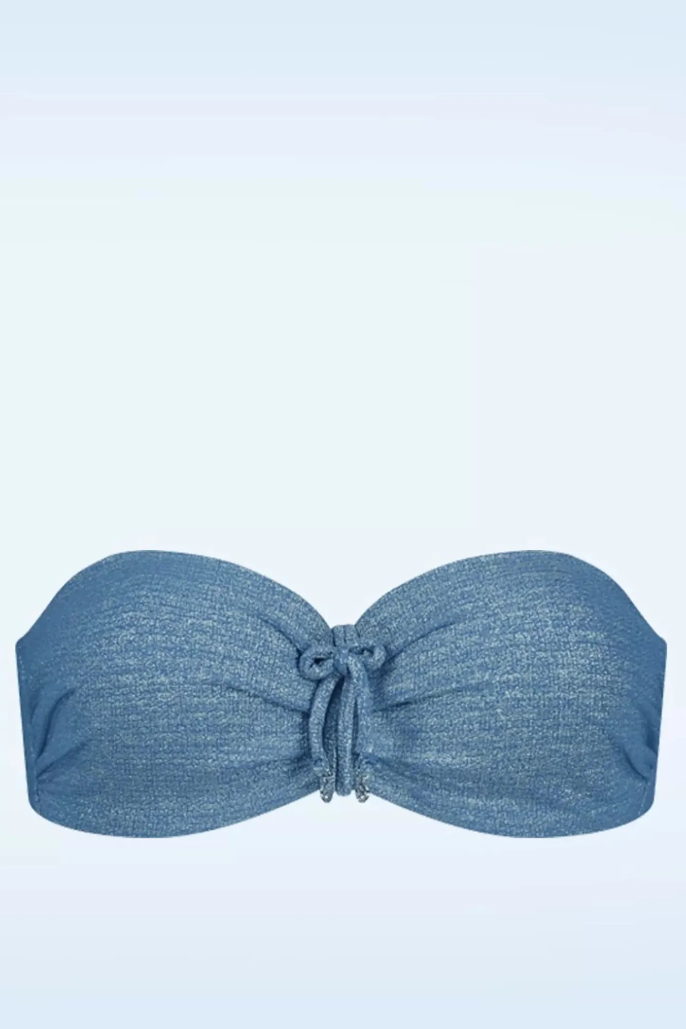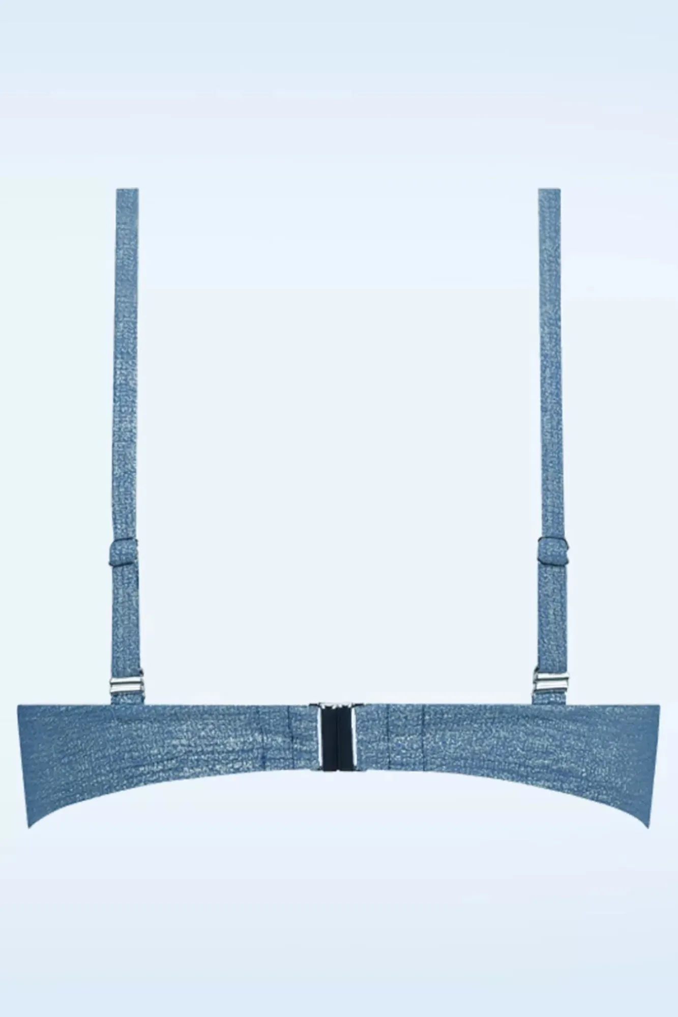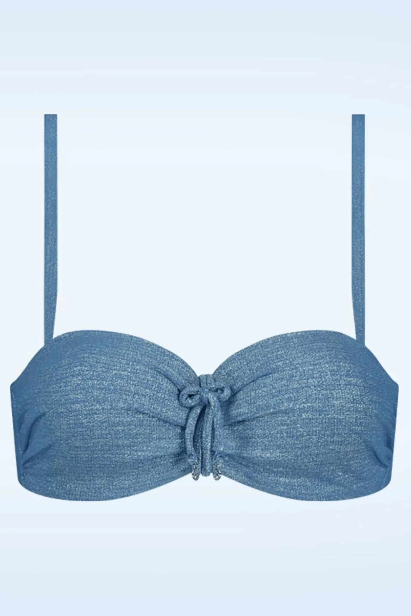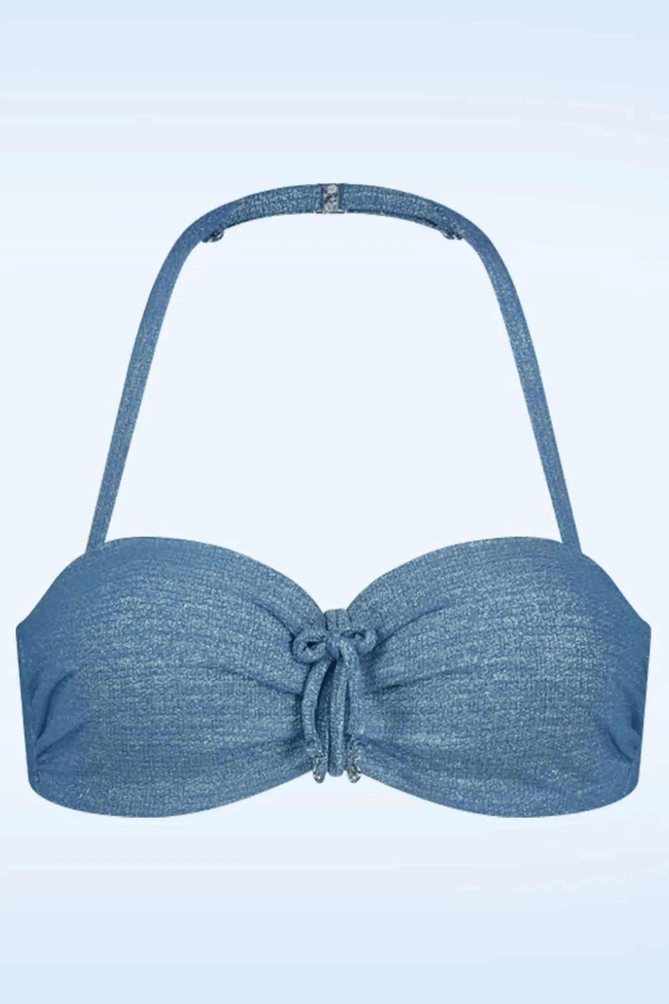 Der Strand Wird Zu Deinem Persönlichen Catwalk, Wenn Du Dieses Bikini Top Trägst! Versehen Mit Einem Bügel Und Padded Cups, Die Für Unterstützung Sorgen Und Dir Ein Wunderschönes Dekolleté Bescheren, Kannst Du Dieses Top Auf Mehrere Arten Tragen; Mit Schulterträgern, Trägerlos Oder Als Neckholder. Plissiert Und Mit Einer Festen Schleife Zwischen Den Cups Wurde Es Aus Einem Bequemen, Perfekt Anliegenden Blauen Stoff Mit Silberfarbenen Glitzer Gefertigt – Für Ein Wenig Glamour In Der Sonne. “Too Glam To Give A Damn!“