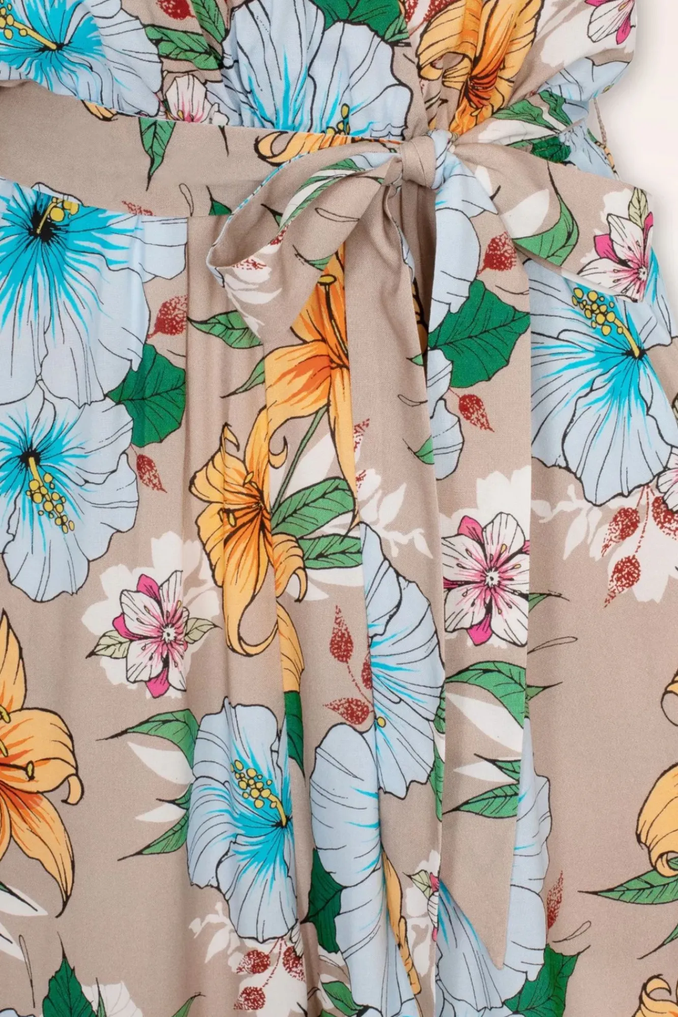 “Paradise Is Calling!“ Dieser Jumpsuit Wurde Aus Einer Luftig Angenehmen Beigen Viskose Gefertigt, Die Mit Tropischen Blumen Versehen Wurde.&Nbsp;