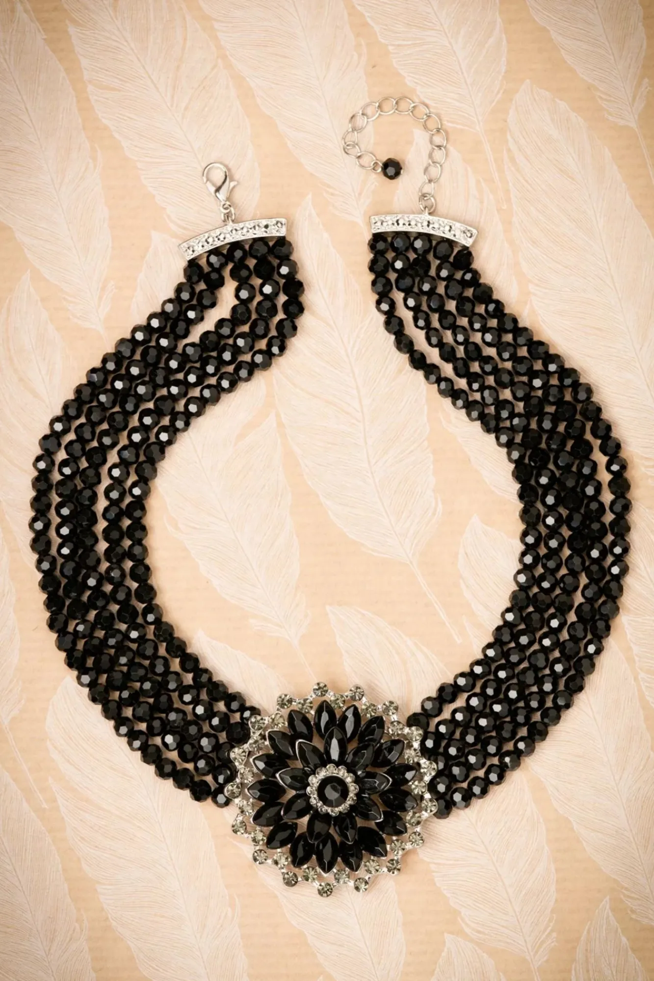 Fühle Dich Genauso Funkelnd Schön Wie Audrey Mit Dieser 50Er Audrey Jet Flower Kette In Schwarz Und Silber! Diese Kurze Kette Wurde Mit 5 Reihen Kleinen, Schwarzen Glasperlen Und Einer Großen, Silberfarbenen Blume Als Eye-Catcher Gestaltet. Die Facettierten, Geschliffenen Steine Und Strassteine Vollenden Den Glamourösen Look. Dieses Hübsche Hätte Audrey Bestimmt Auch Gerne In Ihrer Sammlung Gehabt!