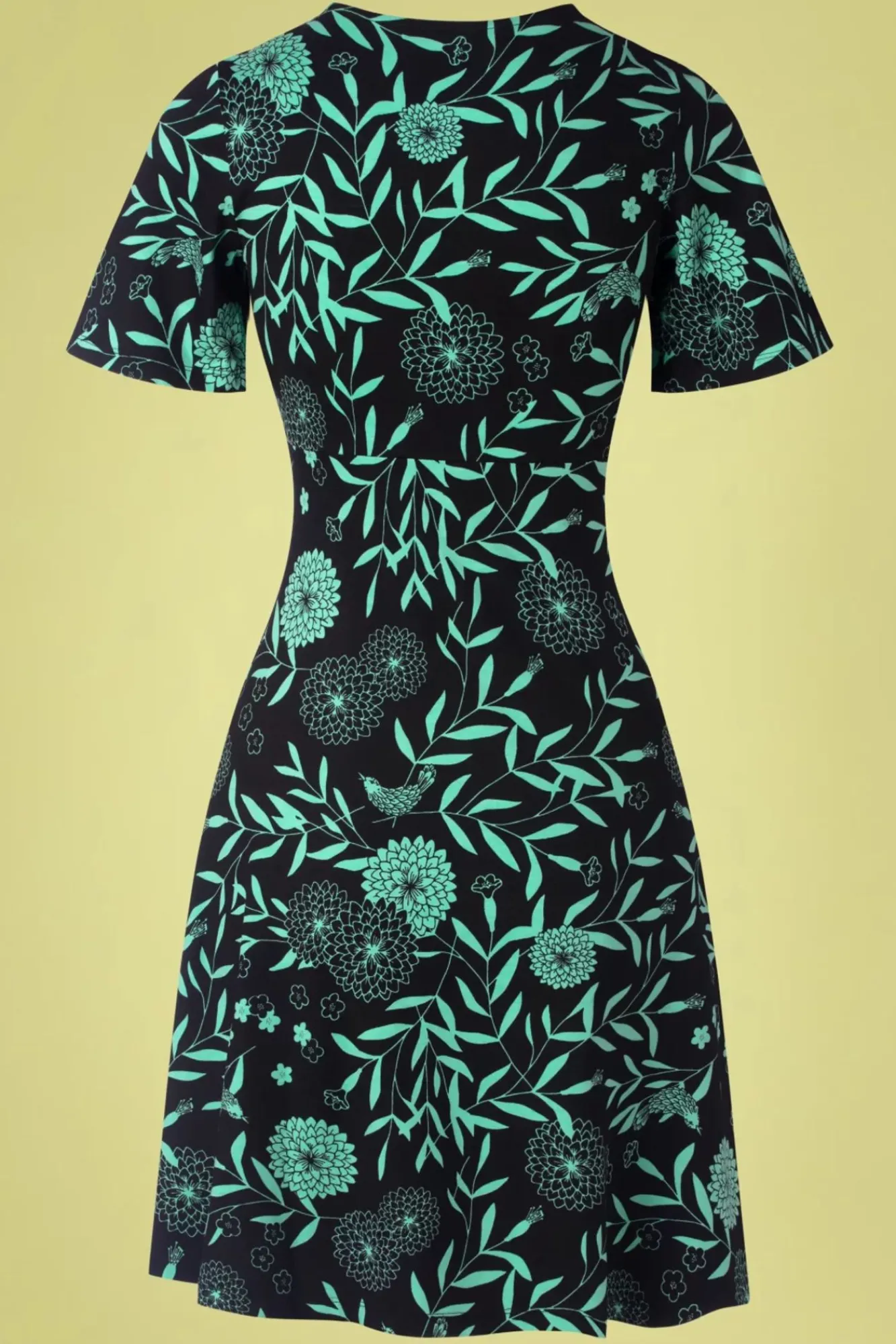 Wir Können Von Diesem Mint Cocktail Kleid In Japanese Flowers Green Nicht Genug Bekommen! Es Hat Einen V- Ausschnitt, Kurze Ärmel Und Wird Ab Der Taille Zu Einer Schmeichelhaften A-Linie. Gefertigt Aus Einem Angenehm Fallenden, Dehnbaren, Schwarzen Ecovero Viskosemix Mit Grünen Blumen Und Blättern. Jeder Tag Ist Wunderschön Mit Diesem Schätzchen!! 😉