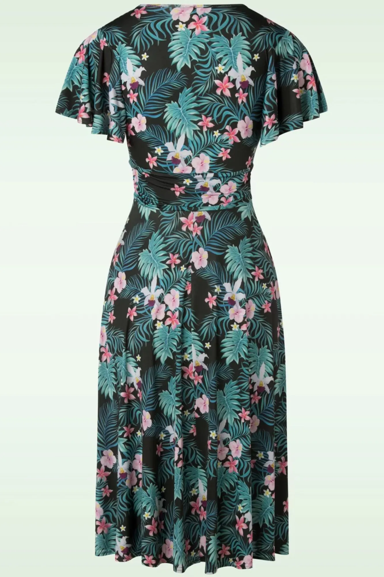 Dieses 50Er Irene Tropical Floral Cross Over Swing Kleid In Schwarz Ist Eine Echte Vintage-Perle! Dieses Hübsche Kleid Wird Dich, Mit Dem Wundervollen Figurbetonten Top In Wickeloptik Mit Einer Sexy V-Halslinie Und Den Verspielten Bindeschleifen, Die Du Sowohl Lose Als Auch Zusammengebunden Tragen Kannst, Und Den Schmeichelnden Raffungen, Ein Super Weibliches Gefühl Geben. Die Schwungvollen Flügelärmel Verleihen Einen Verspielten Akzent Und Der Semi-Swing Rock Ergibt Eine Elegante Ausstrahlung, Wow! Aus Einem Glatten, Fließenden, Leicht Glänzenden Und Dehnbaren, Schwarzen Stoff Der Ein Motiv Aus Tropischen Blumen Und Blättern Zeigt, Viel Tragekomfort Garantiert Und Knitterfrei Ist. Irene Ist Liebe, Die Liebe Zu Einem Hübschen Kleid!
