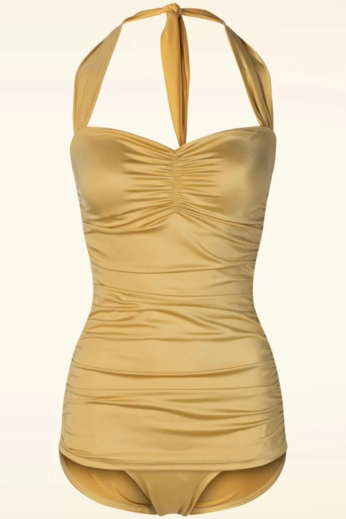 Neue Kollektion ~ Wir Haben Uns – Wie Zuvor Auch Marilyn Monroe – Bis Über Beide Ohren In Dieses Schätzchen Verliebt! Ein Neckholder-Top Mit Plissierter Sweetheart Halslinie Und Raffungen An Den Seiten, Damit Die Taille Schlanker Wirkt Und Dem Typischen Kleidchen Mit Plissierter Vorderseite, Die Zu Schmeicheln Weiß. Das Ausgeklügelte Design Und Die Verwendeten Materialien Sorgen Dafür, Dass Dieser Badeanzug Für Jeden Körpertyp Geeignet Ist. Gefertigt Aus Einem Dehnbaren Stoff In Gold, Mit Eingenähten Soft-Cups Und Einem Elastischen Unterbrustband Für Extra Unterstützung Und Ein Schönes Dekolleté. Dieses Schätzchen Ist Ein Wahres Must-Have – ‚Do It Like Marilyn‘ 😉