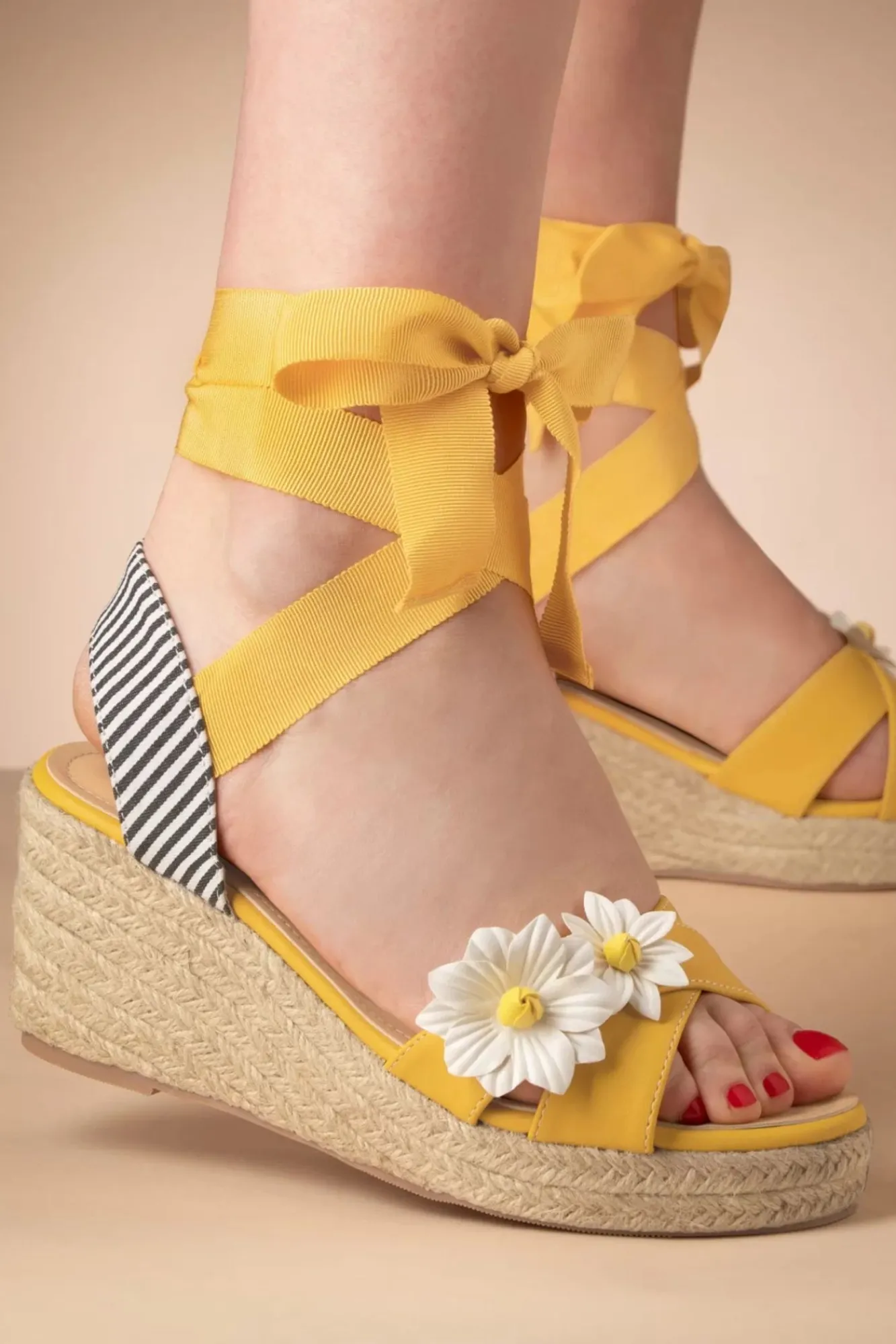 Dein Frühlingslook Erreicht Kinderleicht Ein Neues Niveau, Wenn Diese Lady Daisy Wedges In Gelb Deine Füße Schmücken! Die Perfekte Alternative Für Deine High Heels, Denn Sie Lassen Deine Beine Länger Erscheinen, Während Sie Herrlich Bequem Sind! Gefertigt Aus Einem Sonnengelben ‚Faux‘ Leder, Versehen Mit Bindebändern, Die Du Ganz Grazil Um Deine Knöchel Binden Kannst. Wunderschöne Gänseblümchen Zieren Den Spann Und Natürlich Haben Sie Die Typische Raffia Plateausohle.“Oopsie Daisy, Added Them To My Cart Already!“ 😉