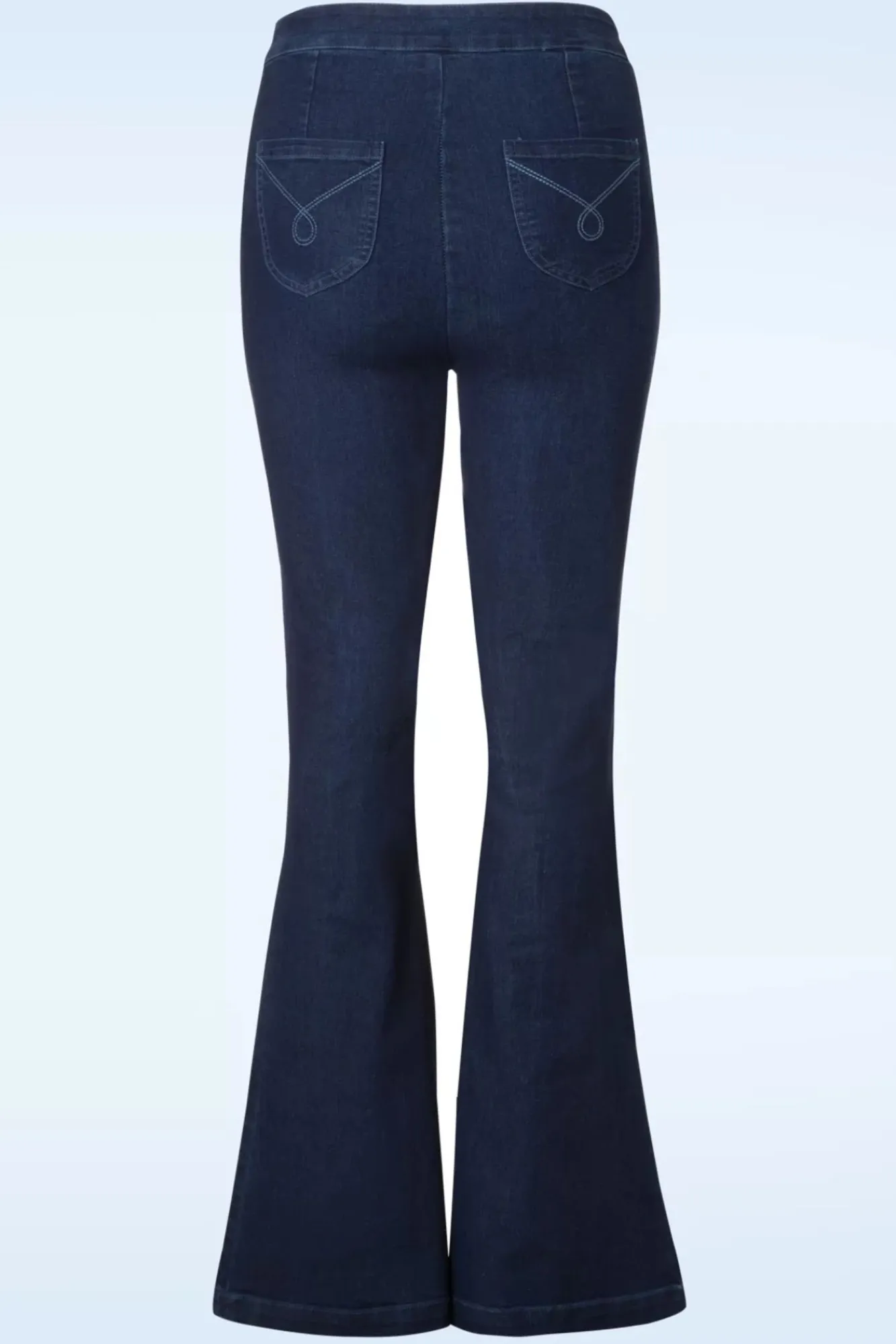 Diese 70S Legs Eleven Flared Trousers In Denim Sind So Bequem, Dass Du Sie Jeden Tag Tragen Möchtest! Kein Wunder Dass Diese Schlaghosen In Den 70Er Jahren Ein Echter Trend Waren Und Heute Ihr Comeback Erleben! Die Ab Dem Knie Weit Ausgestellten Hosenbeine Sind Verspielt Und Schmeichelnd, Sie Werden Deine Beine Endlos Wirken Lassen. Hergestellt Aus Einem Festen,, Dehnbaren Baumwolle-Mix In Jeansblau, Herrlich Trageleicht. How I Like My Trousers? Comfy, Fabulous And… Flared!