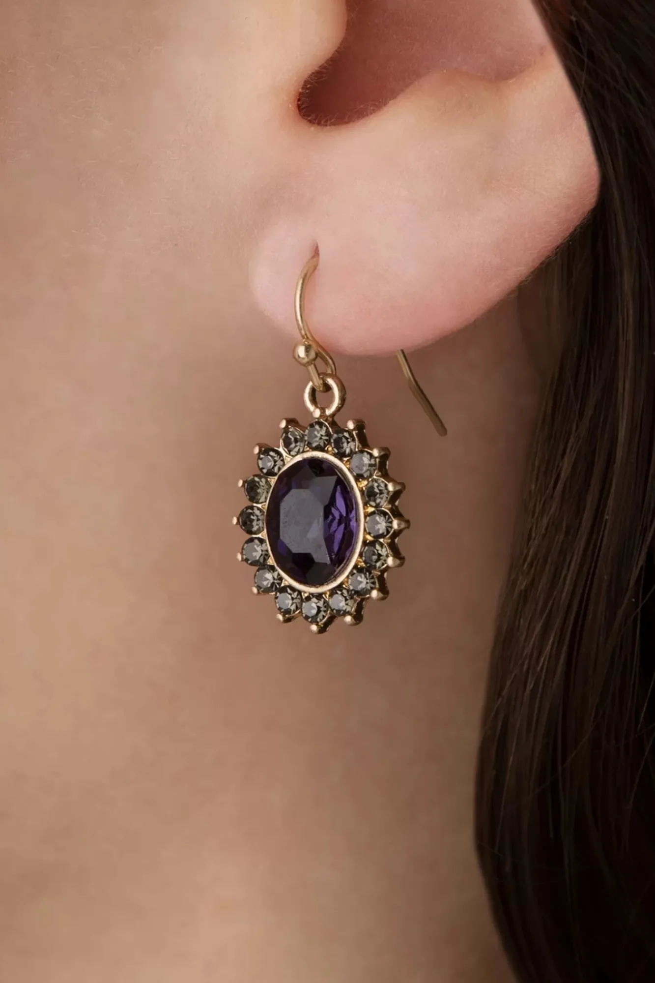„Adorn Yourself In Sophistication!“ – Diese, Der Regency Ära Nachempfundenen, Goldfarbenen Ohrringe Wurden Mit Einem, Von Funkelnden Strasssteinen Umringten, Lila Glaskristall Versehen.